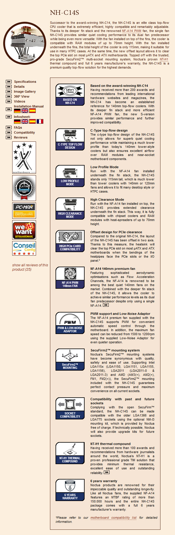 ……….สวัสดีครับ วันนี้มี CPU Cooler จาก Noctua มาฝากกันครับ กับ Noctua NH-C14S CPU Coolers ซึ่งเป็น CPU Coolers ในระดับท็อป หน้าตาดุดันครับ รูปลักษณ์ภายนอกก็เป็น CPU Cooler C-Type top-flow design ตัวพัดลมช่วยระบายความร้อนให้ Ram อีกด้วย และยังมี 7 Heat-pipe ทำจาก Copper และ Aluminum Alloy เคลือบนิเกิล เงางามทั้งตัว ประสิทธภาพการระบายความร้อนจะเป็นเช่นไรไปชมพร้อมๆกันครับ แต่ก่อนอื่นต้องไปชมรายละเอียดจากเว็บไซต์ผู้ผลิตกันก่อนครับ