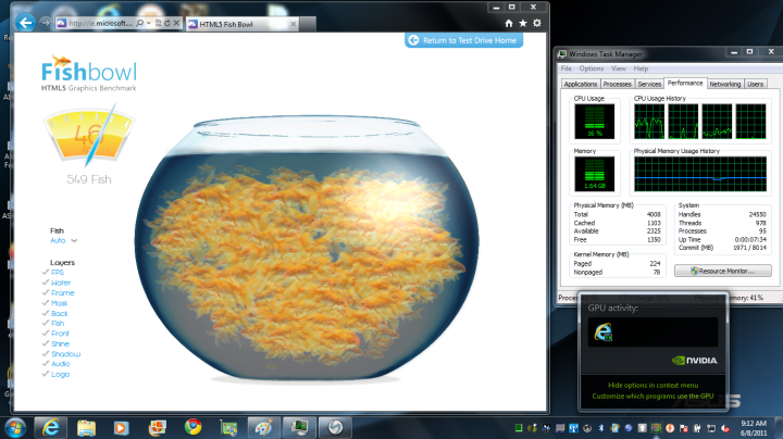 การทดลองของผม ผมได้ใช้เดโม Fishbowl Benchmark ของ HTML 5.0 ในโปรแกรม Internet Explorer 9.0 ที่สนับสนุนการเร่งควาเร็ว HTML 5 ด้วย GPU อย่างเต็มรูปแบบ มาทดลองครับ