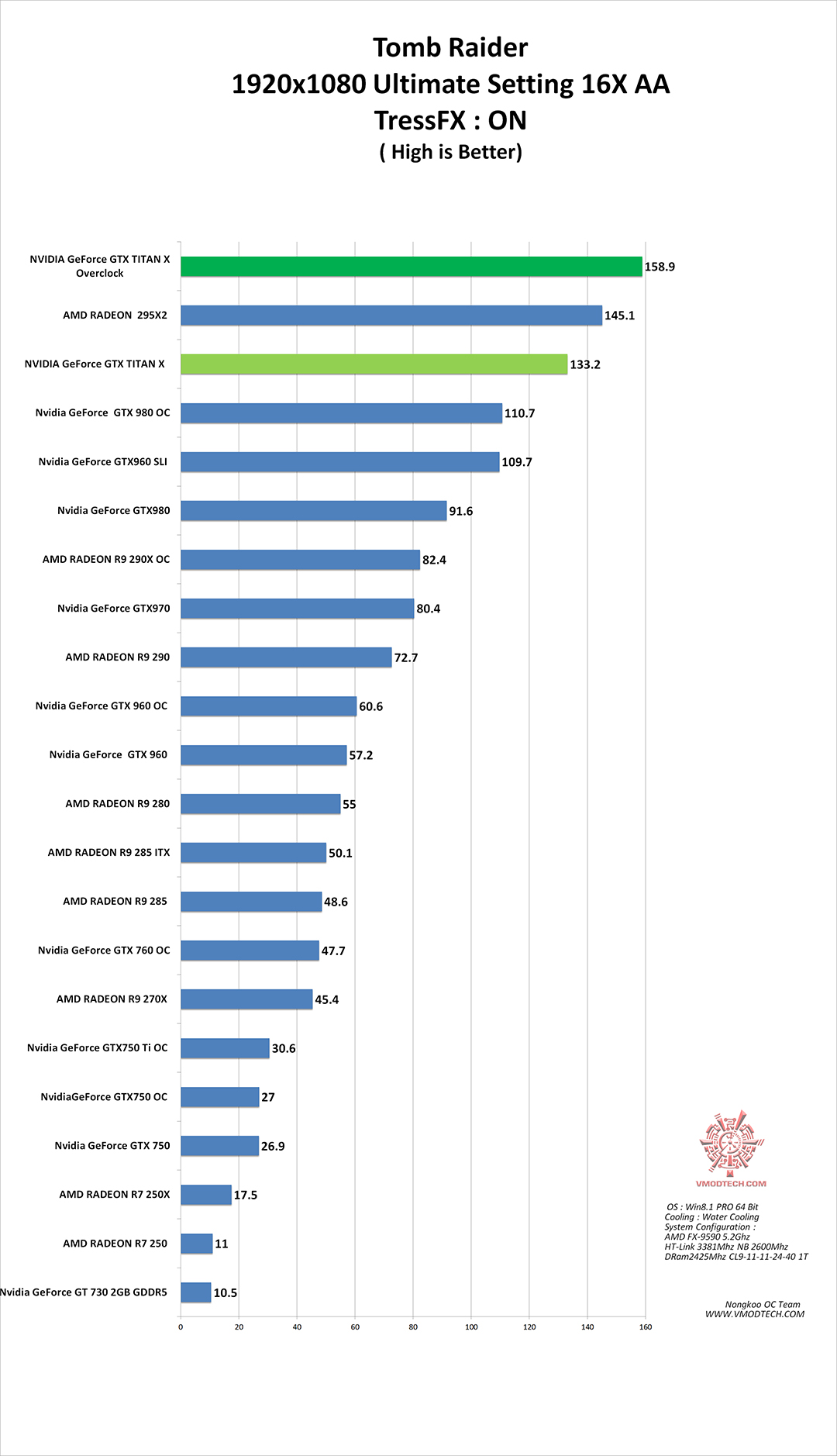 ก็มาถึงช่วงท้ายกันครับสำหรับการทดสอบ NVIDIA GeForce GTX TITAN X 12GB GDDR5 ที่วันนี้ทำประสิทธิภาพความแรงได้แบบสุดยอดจริงๆ กับผลคะแนนทดสอบที่ออกมาชนิดอยู่หัวแถวแทบทุกการทดสอบ ซึ่งถ้าจะเปรียบเทียบแล้วกล่าวได้เลยครับว่าเป็นการ์ดจอที่มี Single GPU ที่แรงที่สุดในโลก ณ เวลานี้เลยก็ว่าได้ครับ กับการทดสอบที่ใช้งานร่วมกับซีพียู AMD FX-9590 ถือว่าทำผลงานออกมาได้ดีมากในระดับนึงครับ สามารถใช้งานกันได้อย่างสบายๆเล่นกันได้อย่างลื่นไหลทุกเกมส์แน่นอนครับตามในผลทดสอบ สำหรับในวันนี้ก็คงจะเป็นแนวทางสำหรับท่านที่เลือกใช้ซิสเต็ม AMD อยากได้การ์ดจอทางฝั่งของทาง Nvidia ตัวแรงสุด ณ เวลานี้มาใช้งานอย่าง Titan X รับรองว่าใช้งานกันได้อย่างแน่นอนอีกทั้งแรงขั้นเทพฯสุดๆกันอย่างแน่นอนครับ สำหรับท่านใดที่ถามไม่เทส 4K หรอ อันนี้ต้องขออภัยจริงๆในเรื่องของเวลาที่จำกัดประกอบกับในการเปิดตัวคราวที่แล้วทางทีมงานก็ได้เทสผลของ 4K ไว้ให้ท่านได้รับชมกันไปบ้างแล้วนะครับ โดยท่านสามารถย้อนหลังไปชมกันได้นะครับ สรุปสั้นๆส่งท้ายถ้าท่านต้องการหาการ์ดแรงๆมาเล่นเกมส์ในระดับ 4K หรือ Full HD แบบเปิดเต็มๆแม๊ก NVIDIA GeForce GTX TITAN X 12GB GDDR5 นี่แหละครับตอบโจทย์ของท่านได้อย่างแน่นอน ส่วนราคาผมได้ยินแว่วๆมาที่ 9XXดอลล่าสหรัฐฯ แต่เข้าไทยจะเปิดมาราคาไหนอันนี้ก็ไม่อาจคาดเดาได้จริงๆ สำหรับในวันนี้กระผมก็ขอตัวลาไปก่อน พบกันใหม่เร็วๆนี้กับรีวิวอุปกรณ์ใหม่ๆจัดเต็มทุกการทดสอบที่ Vmodtech.com สวัสดีครับ