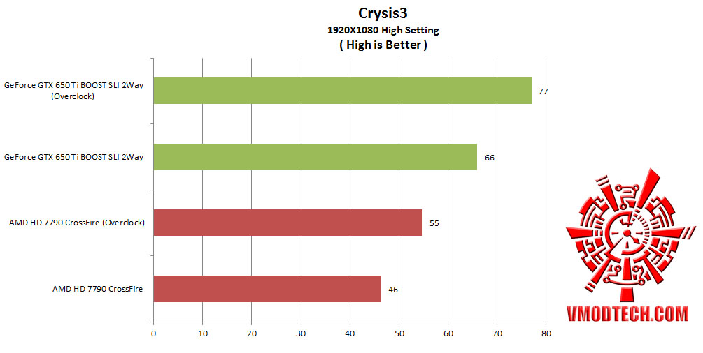 Crysis3 ปรับรายละเอียดแบบ High เล่นได้แบบลื่นไหลกันทั้งสองครับผม แต่ทางฝั่ง Nvidia GeForce GTX650 Ti Boost 2-Way SLI ทำเฟรมเรตเฉลี่ยได้ดีกว่ามากครับทั้ง DF/OC