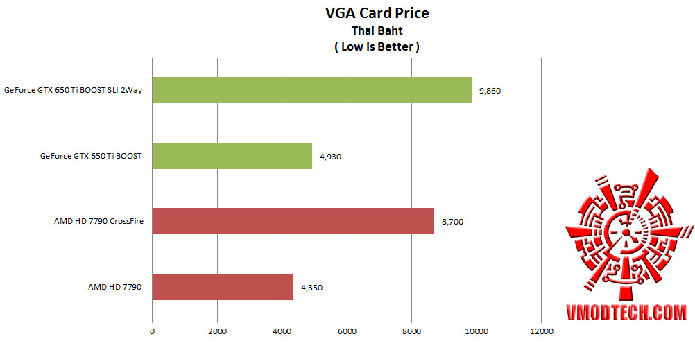 Nvidia GeForce GTX650 Ti Boost 2-Way ถ้าคำนวณตามราคาคำนวณก็ตกราวๆ 9860บาท แต่ถ้าวางจำหน่ายจริงตามยี่ห้อรุ่นซื้อสองตัวน่าจะราวๆหมื่นต้นๆโดยประมาณครับ สำหรับ AMD Radeon HD 7790 CrossFire ราคาคำนวณอยู่ที่ 8700บาท จำหน่ายจริงตามยี่ห้อรุ่น สองตัวน่าจะอยู่ที่เก้าพันต้นๆไปหากลางครับผม ถ้าวางจำหน่ายในไทยราคาคงเพิ่มมากขึ้นกว่านี้ตามยี่ห้อและรุ่นปรับแต่งต่างๆ