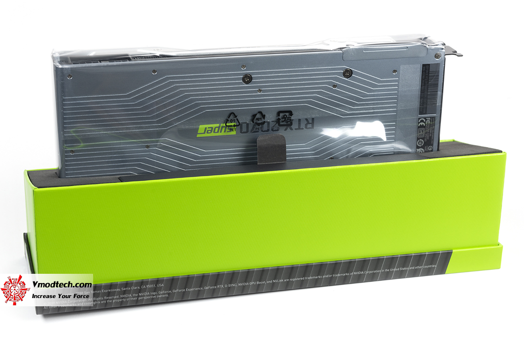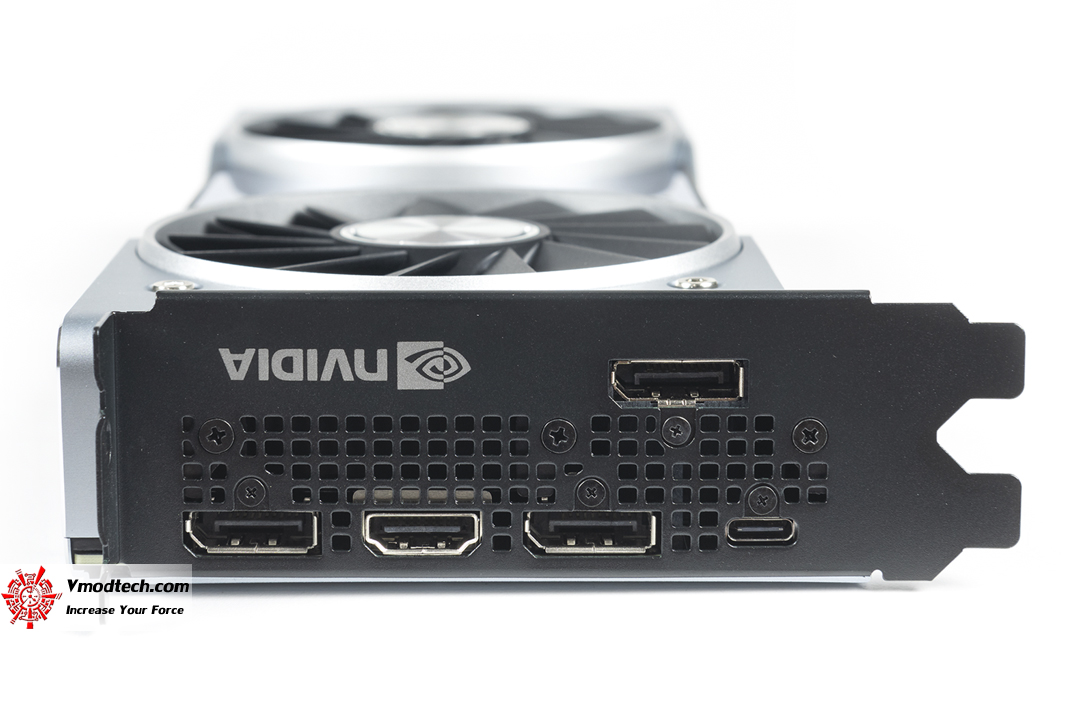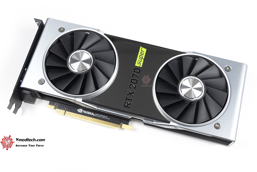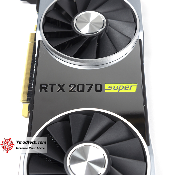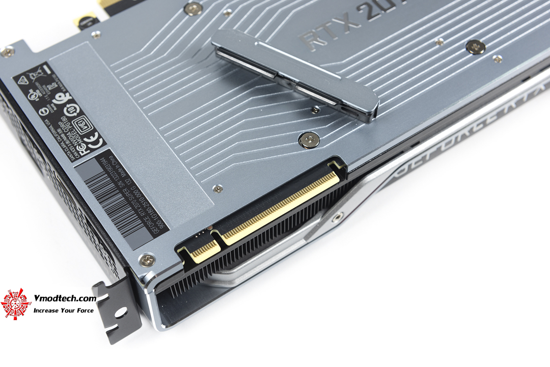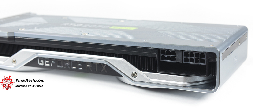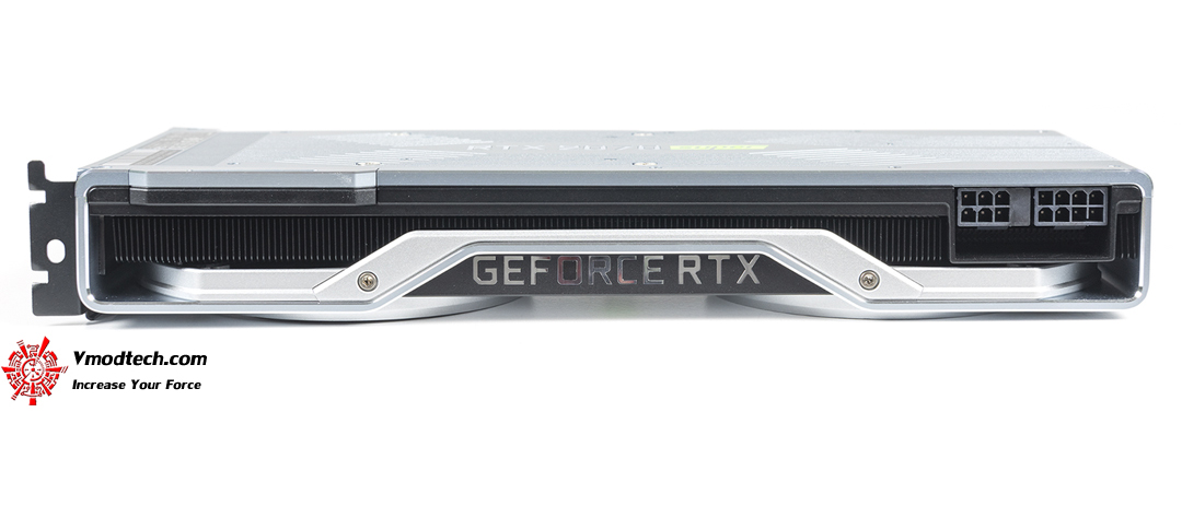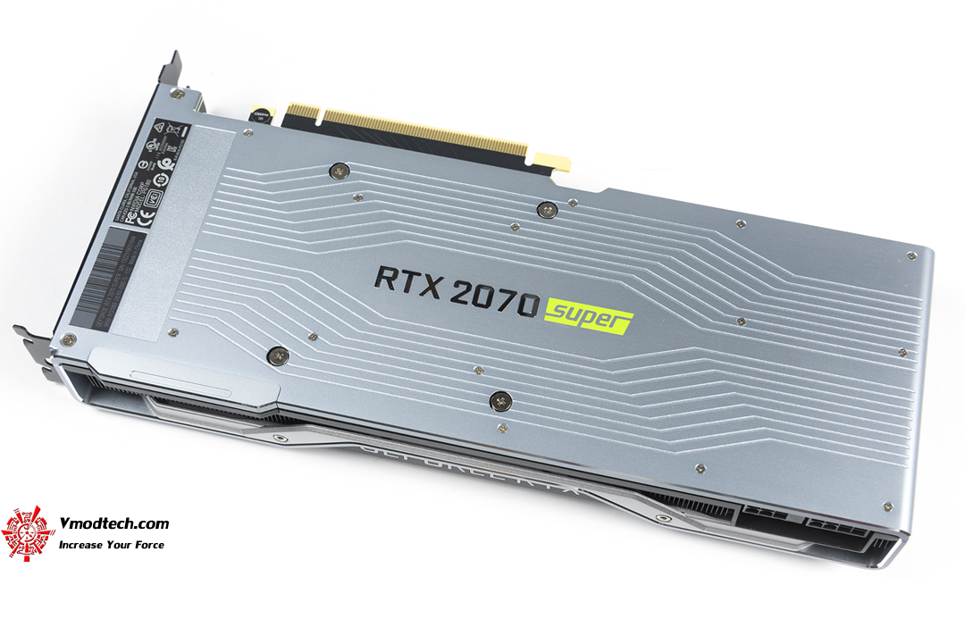 ในมุมนี้จะเห็นโครงสร้างของการ์ดที่ถูกขึ้นรูปและดัดพับจากโลหะเบาที่มีขนาดหนา ตัวการ์ดมีความหนาสองสล๊อดเช่นเคย ส่วนอัตราการใช้ไฟนั้น RTX 2070 SUPER ต้องการไฟจากหัวแบบ PCIe แปดพินหนึ่งหัว และหกพินอีกหนึ่งหัวครับ