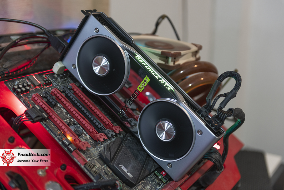 ในมุมนี้จะเห็นโครงสร้างของการ์ดที่ถูกขึ้นรูปและดัดพับจากโลหะเบาที่มีขนาดหนา ตัวการ์ดมีความหนาสองสล๊อดเช่นเคย ส่วนอัตราการใช้ไฟนั้น RTX 2080 SUPER ต้องการไฟจากหัวแบบ PCIe แปดพินหนึ่งหัว และหกพินอีกหนึ่งหัวครับ