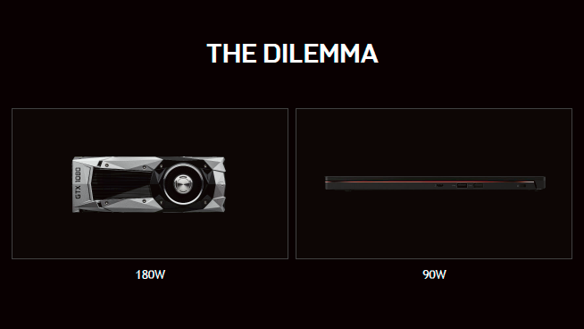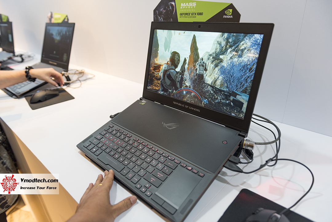 ด้วยการออกแบบที่แยบยลด้วยการยกตัวถังด้านหลังให้สูงขึ้นเมื่อเปิดหน้าจอขึ้นใช้งาน พัดลมภายในจะทำการดูดความเย็นจากภายนอกเข้าไประบายความร้อนภายในตัวถังของโน๊ตบุ๊คที่มีความหนา 18 มิลลิเมตรได้อย่างเหมาะสม จากที่ได้สอบถามจากหัวหน้าฝ่ายขายของ NVIDIA ก็ทราบว่าความสามารถของ GPU บน Platform MAX-Q นั้นต่ำกว่า Desktop GPU ที่เป็นรุ่นเดียวกันอยู่ประมาณ 10% แต่ใครจะแคร์ครับ เมื่อ GPU ซีรีย์ 1000 ทั้ง 1060, 1070, และ 1080 นั้นมีความสามารถ สมรรถนะและประสิทธิภาพที่สูงอยู่แล้ว ก็จะทำให้เกมส์เมอร์จะได้รับประสบการณ์ใหม่ๆในการเล่นเกมส์ด้วยความหนาเพียงแค่ 18 มิลลิเมตร กินไฟต่ำ ความร้อนต่ำ และสามารถหิ้วไปเล่นเกมส์หนักๆได้อย่างสบายที่ไหนก็ได้