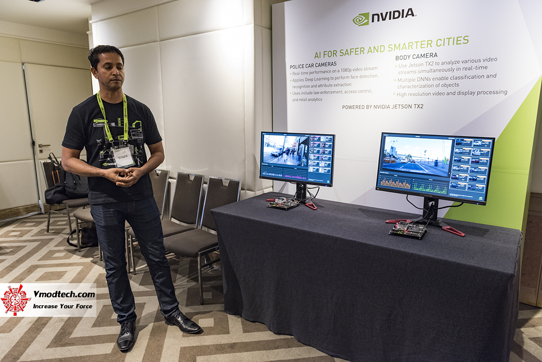 ในงานนั้นก็มีการอัพเดทการใช้งานของ NVIDIA Jetson TX2 ที่ได้เปิดตัวไปเมื่อกลางเดือนมีนาคมที่ผ่านมานี้ โดยในงานนั้นได้ยกตัวอย่างการประยุกต์ใช้งานกับการตรวจสอบบุคคลโดยผนวกโมดูลของ Jetson TX2 เข้าไปไว้กับกล้องเพื่อดีเทค นับจำนวน และแยกแยะเพศของผู้คนตามท้องถนนซึ่งเป็นตัวช่วยในกิจกรรมมากมายครับ และนอกจากนั้น มันยังสามารถที่จะประยุกต์ใช้กับระยนต์ไร้ผู้ขับขี่ได้ โดยการโปรแกรมให้ตรวจสอบพื้นผิวจราจร ระยะห่าง ความเสี่ยงทั้งด้านหน้า ด้านข้างทั้งซ้ายและขวา ด้วยกล้องที่ถูกติดตั้งไว้ตามจุดต่างๆของรถ ซึ่งในขณะนี้นั้นอยู่ในช่วยปรับแต่งให้สมบูรณ์อยู่ครับ เท่าที่ดูแล้วน่าจะเป็นไอเดียที่เป็นจริงได้ในอีกไม่ช้านี้แน่นอนสำหรับรถที่สามารถบังคับตัวเองได้