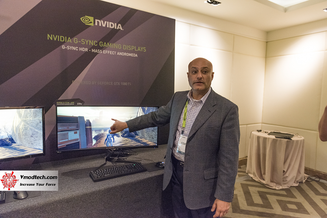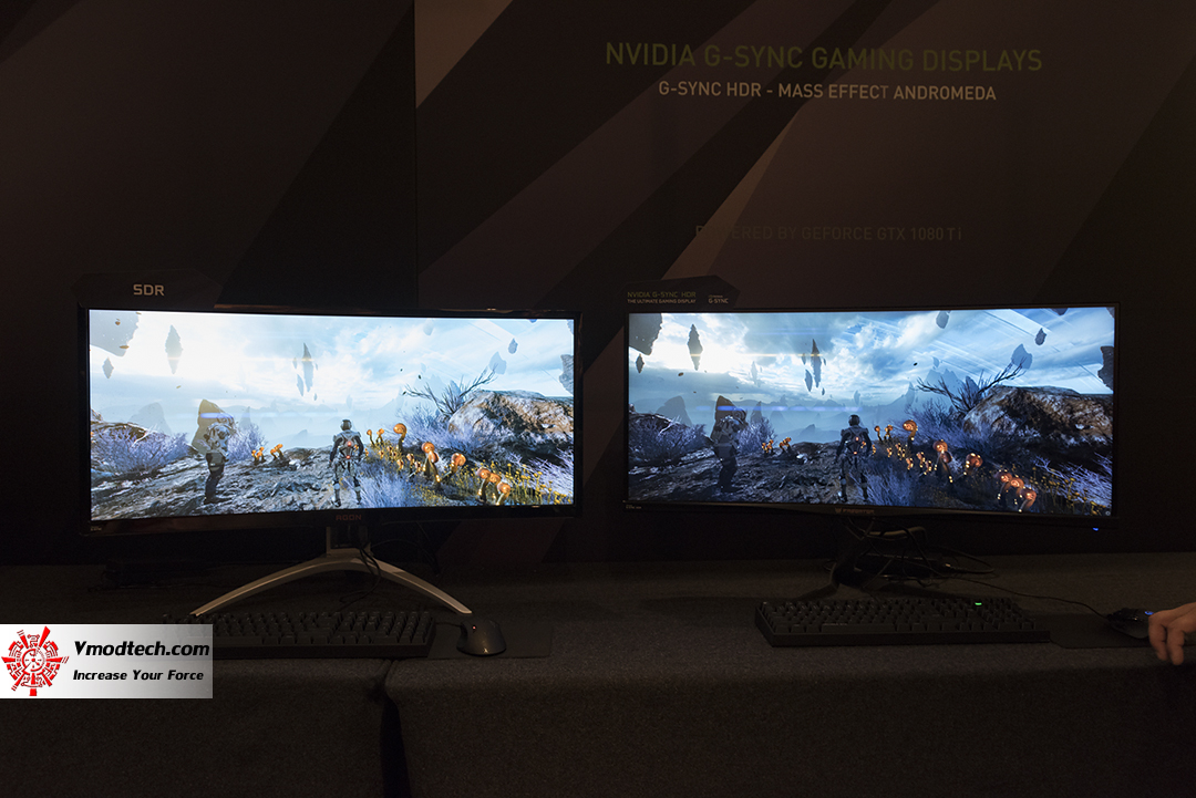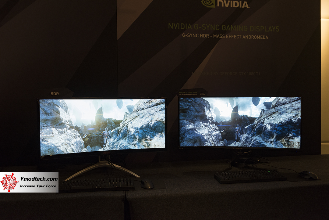 ในงานนั้นก็ได้มีการเปิดตัวเทคโนโลยีของจอรุ่นใหม่ล่าสุดที่มีชื่อว่า NVIDIA G-Sync HDR ซึ่งเท่าที่ผมได้ดูนั้น มันเป็นจอมอนิเตอร์ที่มีความโค้งมากกว่าที่มีอยู่ในปัจจุบันเพื่อตอบสนองมุมมองที่สมบูรณ์แบบ รวมถึงความสามารถในการแสดงนั้นใกล้เคียงความจริงมากที่สุด จากรูปเปรียบเทียบจอโค้งแบบปกติด้านซ้าย กับจอ G-Sync HDR ด้านขวา เราจะเห็นได้ชัดเจนครับว่า รายละเอียดในที่มืดนั้นชัดเจนกว่า สีและรายละเอียดมิดโทนนั้นสมจริงกว่ารวมถึงทิศทางของแสงรวมถึงภูมิประเทศที่สมบูรณ์แบบมาก คือเห็นด้วยตาแล้วต้องบอกว่าทึ่งมากๆครับ ราคาและการวางจำหน่ายได้รับแจ้งว่าคงในไม่ช้านี้