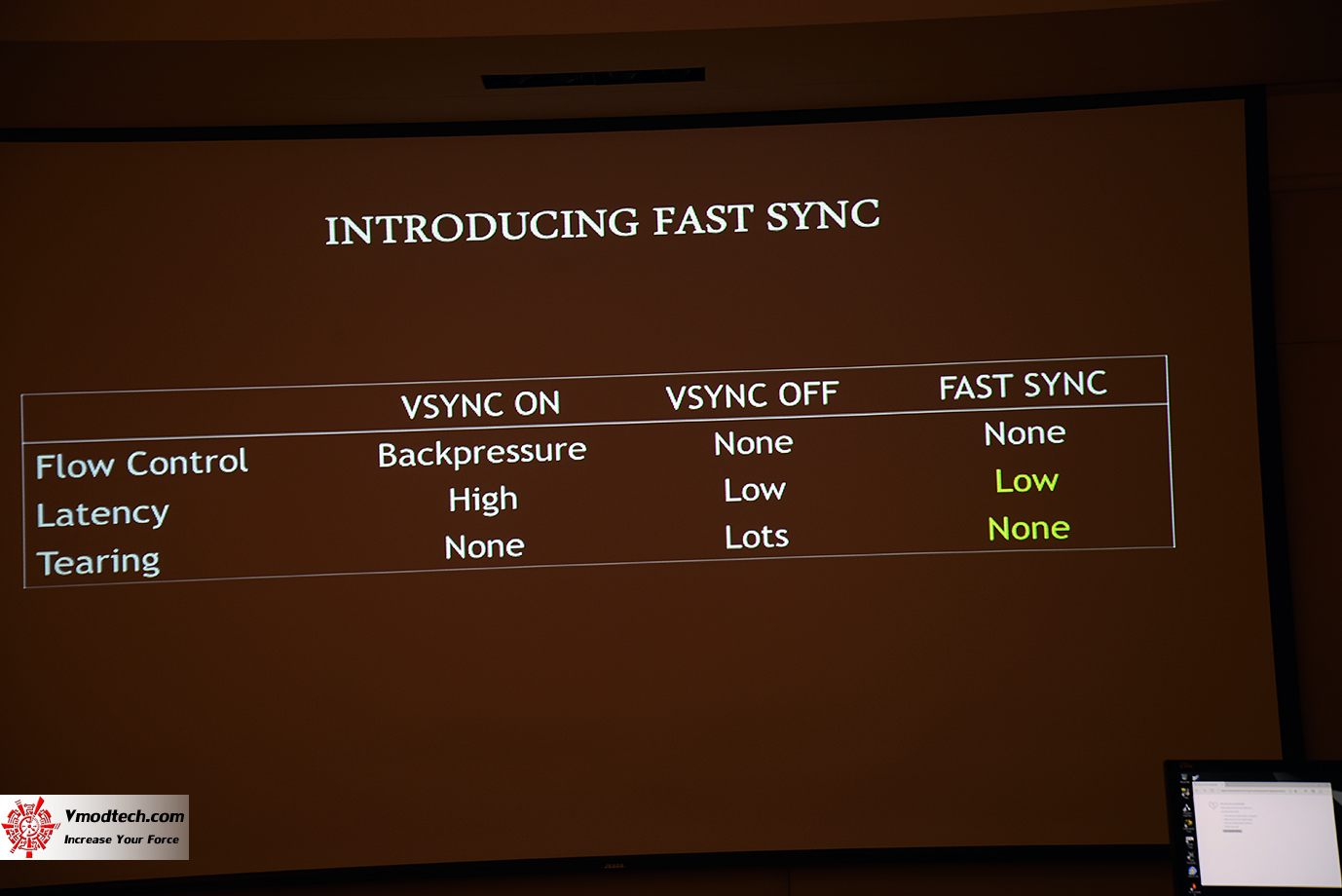 ระบบใหม่ที่เพิ่มเข้ามาก็คือ FAST SYNC ครับ กับการตัดปรับญาเดิมๆที่เราเปิด V Sync เพื่อลดอาการ Tearing หรือ ปิด V Sync เพื่อเพิ่มเฟรมเรตไม่ให้ล๊อก อันนี้พูดง่ายๆคือได้อย่างเสียงอย่างนั่นเองครับ แต่ด้วยระบบ FAST SYNC ของ NVIDIA ปัญหานี้จะหมดไปครับด้วยการจัดการบับเฟอร์สัญญาณใหม่ทำให้ผลที่ออกมานั้นตัดปัญหาภาพแตกหรือ Tearing และ Latency ที่สูงเกินไป FAST SYNC จะมาแก้ปัญหาเหล่านี้ครับ