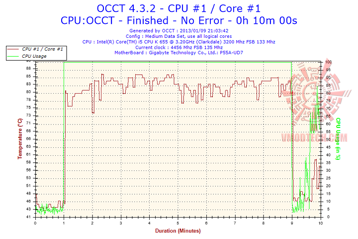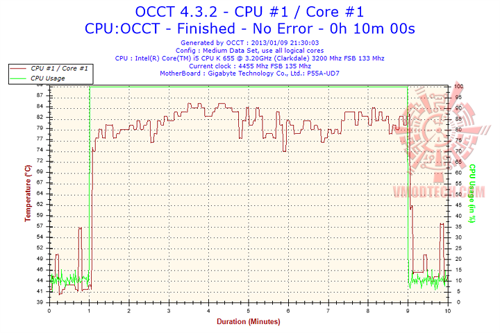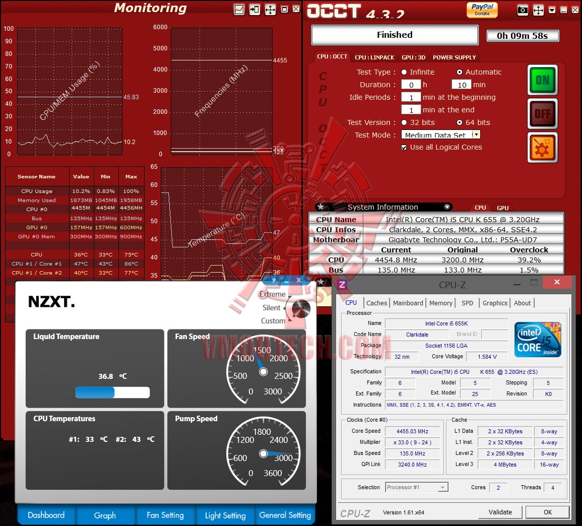 หลังจากติดตั้ง NZXT KRAKEN X40 เสร็จก็ทำการทดสอบกันเลยด้วย OCCT 4.3.2 ในโหมด CPU OCCT Medium Data Set เป็นเวลาสิบนาที โดยผมจะทำการทดสอบสองแบบนะครับ แบบแรกคือปรับรอบพัดลมใน KRAKEN Control เป็น Silent คือเน้นเงียบ และหลังจากนั้นก็จะทิ้งไว้ซักพักให้ความร้อนคลายออกไปแล้วจึงทำการทดสอบอีกครั้งด้วยรอบพัดลมแบบ Extreme