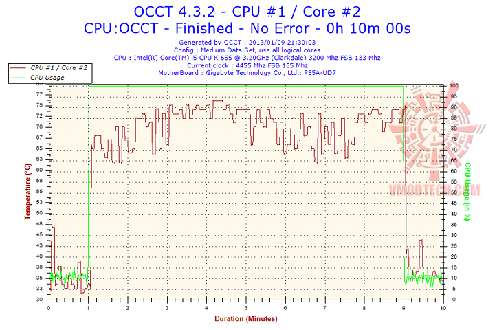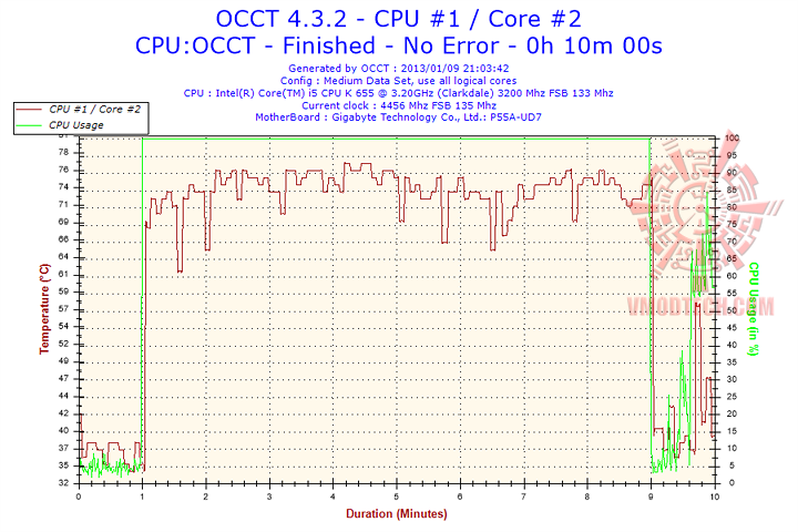 ผลการทดสอบที่อ่านค่าสูงสุดจากโปรแกรมคือ Core1 83, Core 2 74 องศาเซลเซียสครับ จริงๆกราฟมันก็แกว่งมาด้านล่างอยู่พอควรนะครับ กะไม่ถูกเลย อิอิ กำ