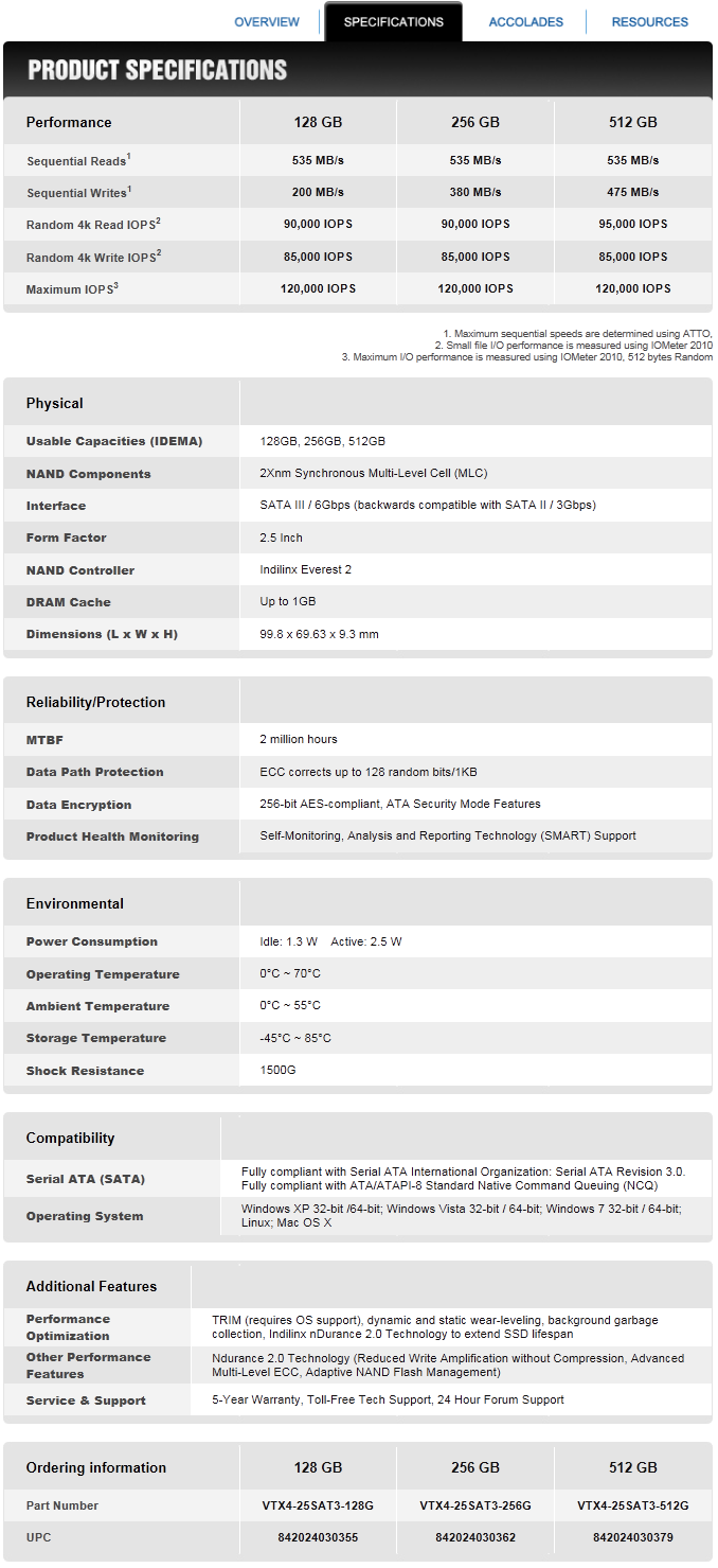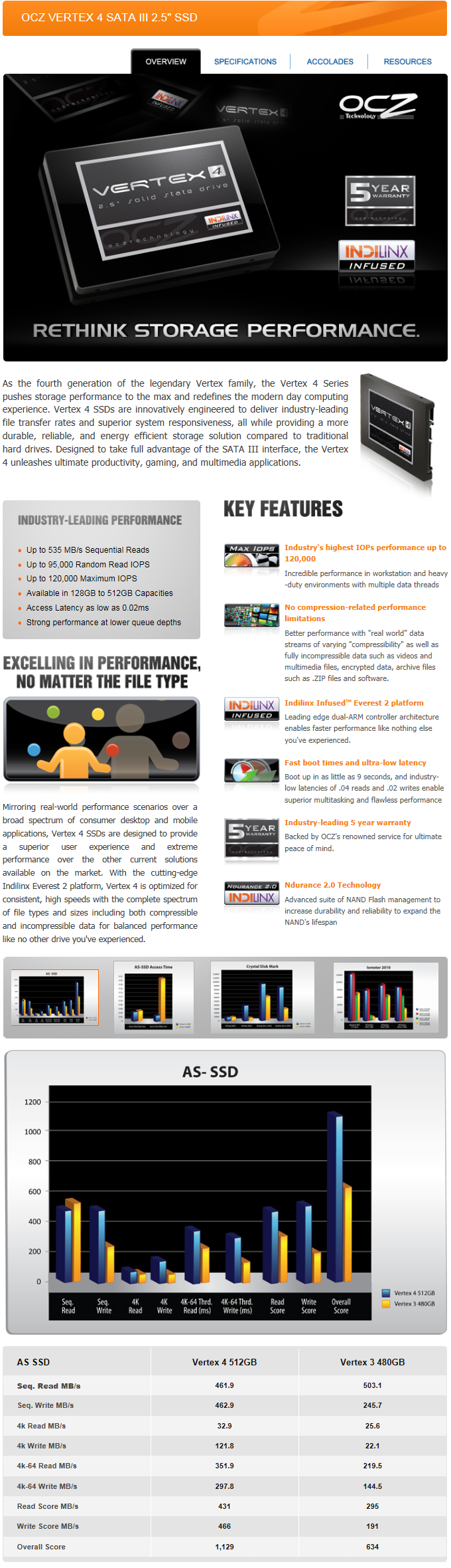 อย่างที่กล่าวไปตอนต้นครับสำหรับข้อมูลเบื้องต้นที่คือ OCZ VERTEX4 SSD SATA III 128GB ใช้ Controller ของ INDILINX Everest เพื่อทำการควบคุม MLC NAND flash ของ Intel ขนาด 25 nm ให้ได้ประสิทธิภาพสูงสุดและความสเถียรต่อระบบมากกว่า Sandforce Controller ที่เคยเป็นมา ด้วยส่งผ่านการต่อเชื่อมแบบ SATA III หรือ 6Gb/s