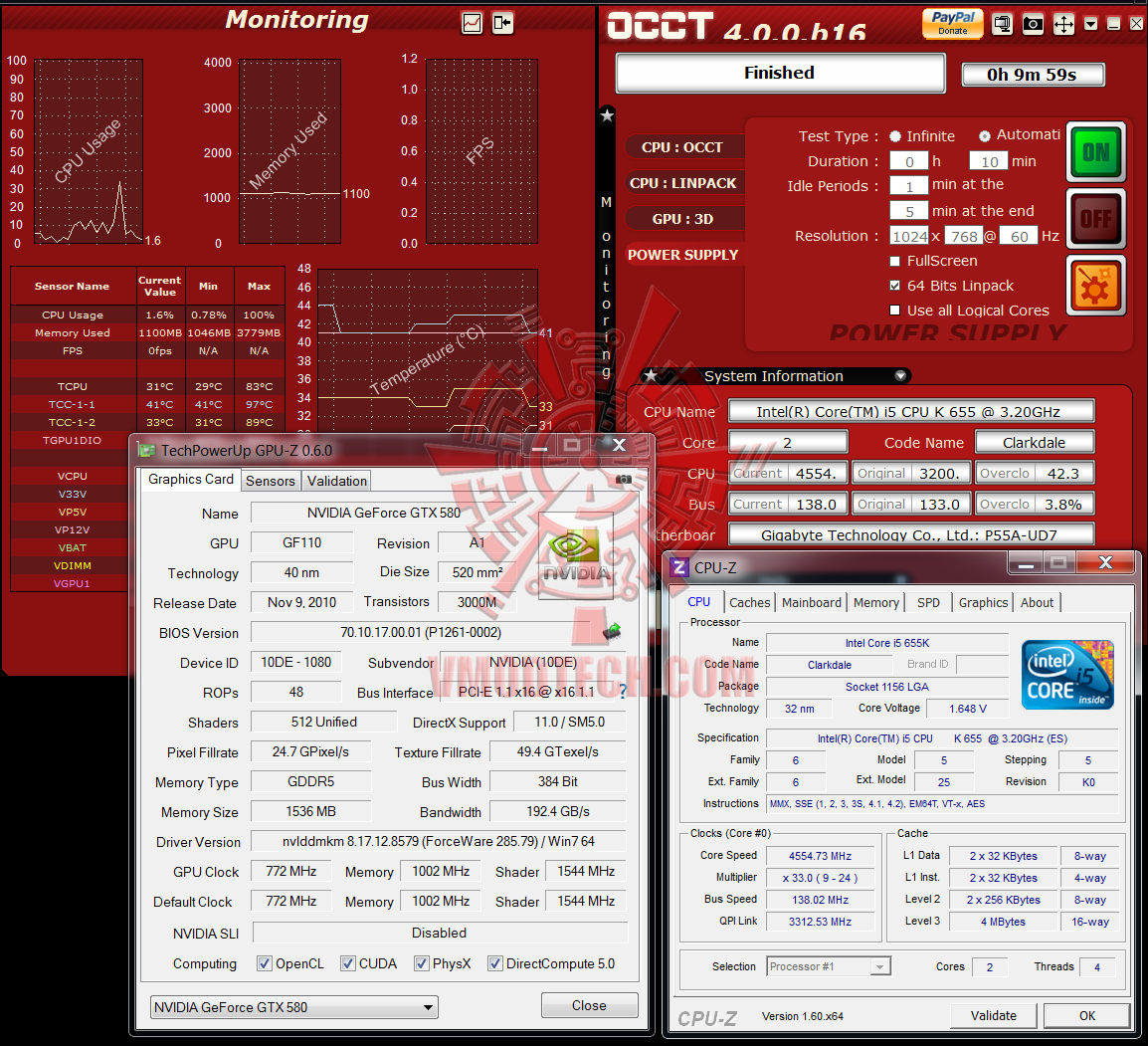 จัดหนักชุดเทสด้วย i5 655K กับ NVIDIA GTX580 กันเลยครับสำหรับวันนี้ โดยที่ CPU จะมีการ Overclock ไปที่ประมาณ 4.55 GHz ด้วยไฟ CPU ที่มากกว่าปกติสาม-สี่เคาะตอนที่ตั้งใน Bios เพื่อให้ระบบดึงไฟจาก PSU มากกว่าปกติ รวมถึงตั้งเป็นมาตรฐานสำหรับเทส Heat Sink ไปด้วยในตัวครับ