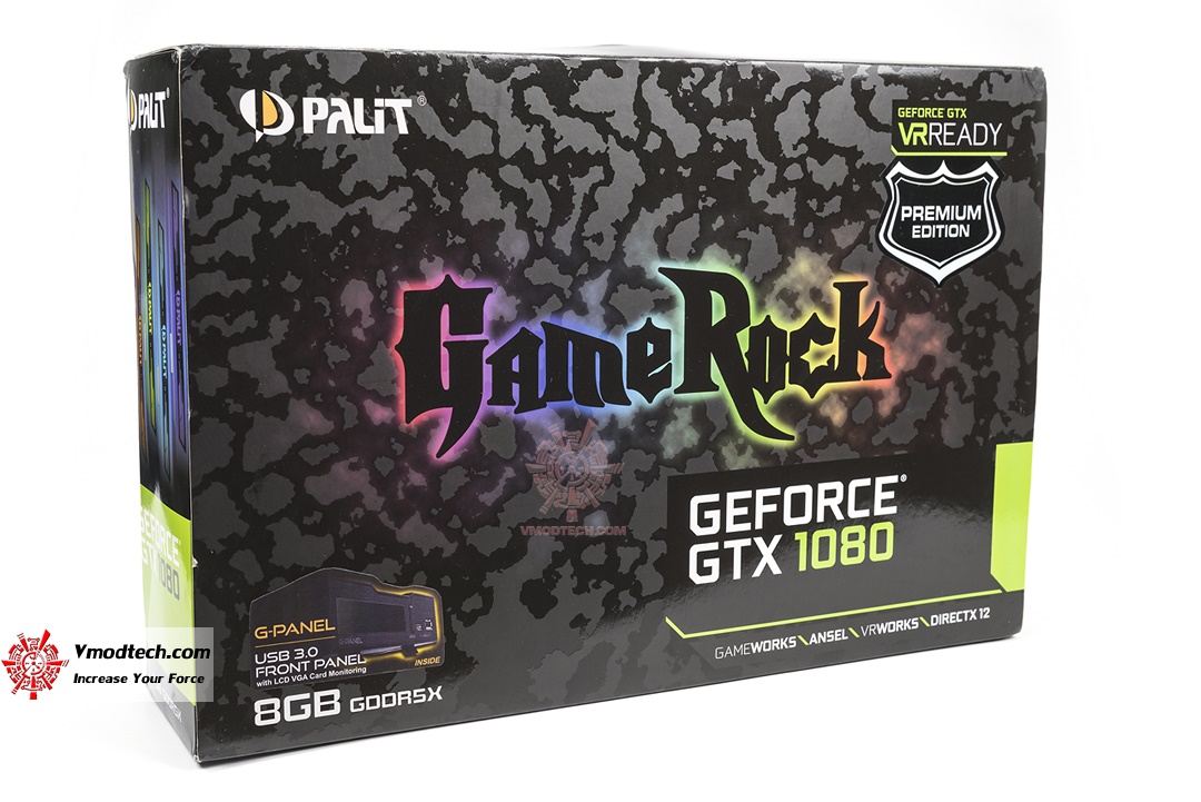 ตัวกล่องของ PALIT GeForce GTX 1070 GameRock Premium Edition สวยงามพอควรเลย มาแบบสีสรรจี๊ดจ๊าดด้วยกระดาษบางๆ
