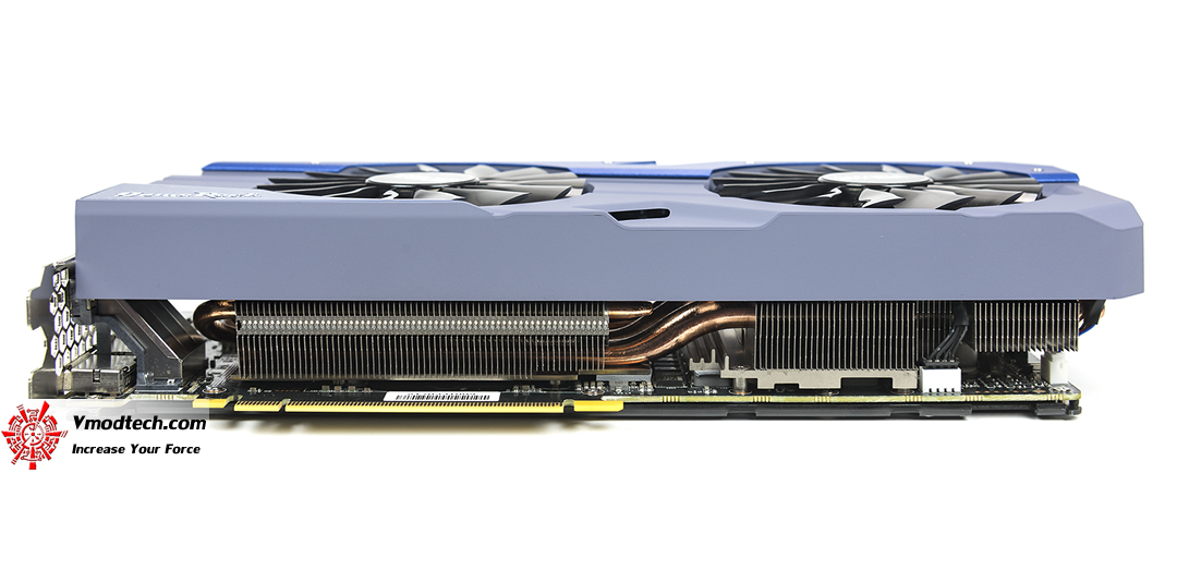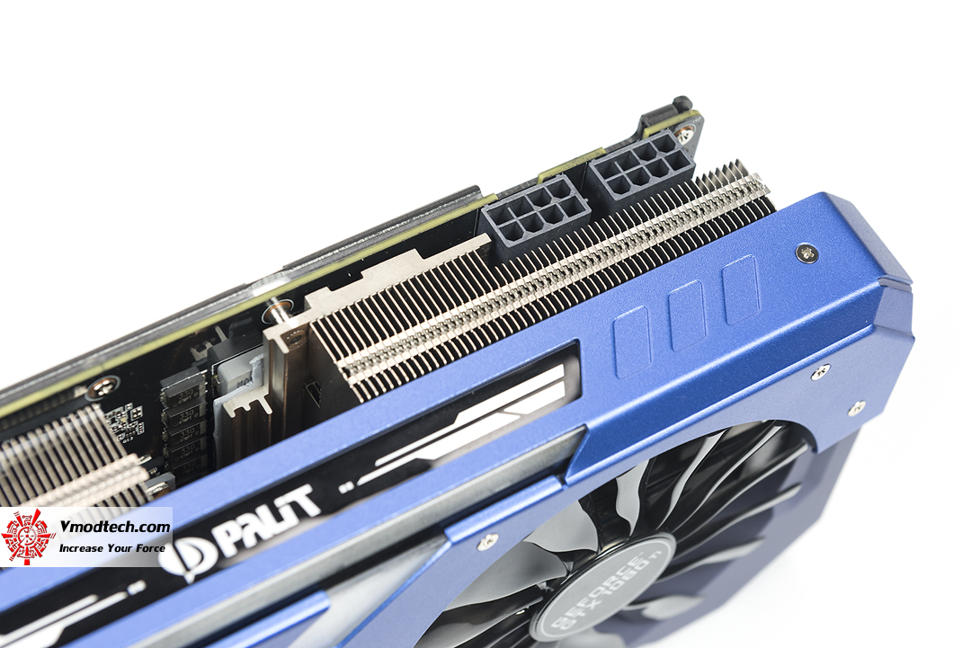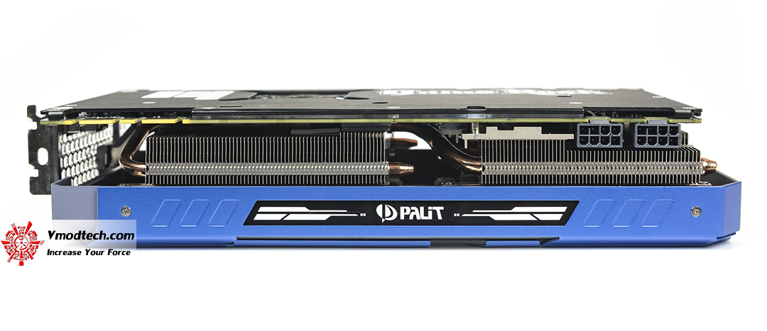 ที่สันการ์ดบริเวณโลโก้ PALIT ซึ่งจะมีแสง RGB LED ด้วยเมื่อเสียบใช้งาน ความต้องการใช้ไฟของ PALIT GeForce GTX 1080 Ti GameRock Premium Edition นั้นต้องการหัวแบบ PCI 8 พินสองหัว