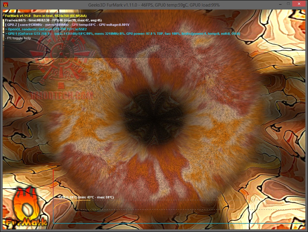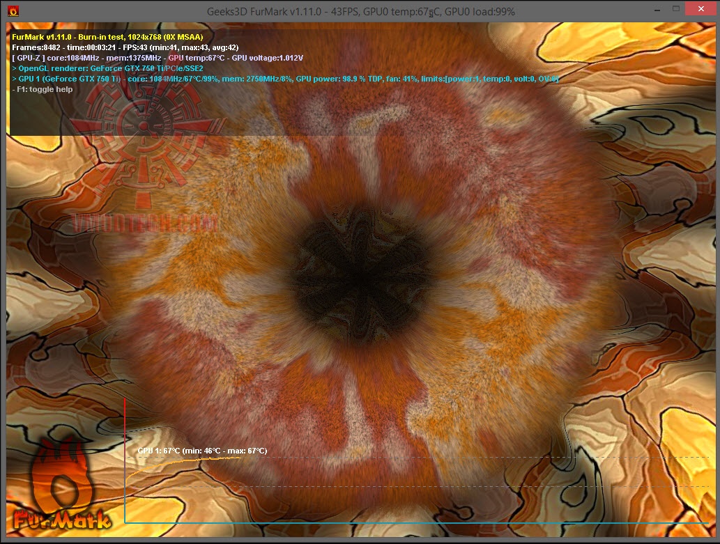 อุณหภูมิของการ์ดขณะ Furmark นั้นจะอยู่ที่ไม่เกิน 67 องศา รอบพัดลมออโต้ 41 เปอร์เซนต์ตามโหมดการทำงานปกติ