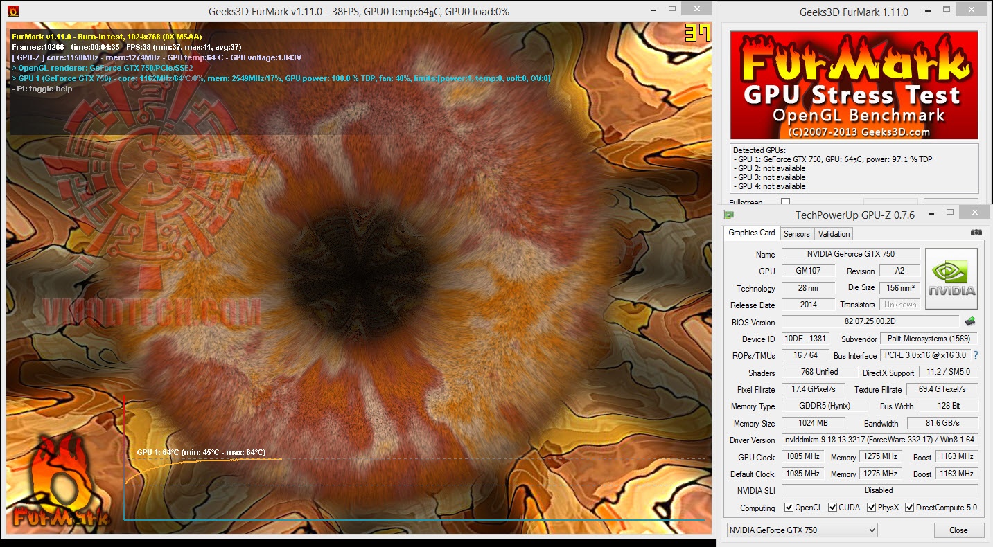 อุณหภูมิของการ์ดขณะ Furmark นั้นจะอยู่ที่ไม่เกิน 64 องศา รอบพัดลมออโต้ 40 เปอร์เซนต์ตามโหมดการทำงานปกติ