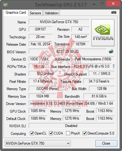 Palit GeForce GTX 750 from GPUZ