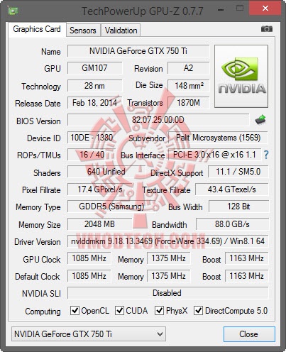 Palit GeForce GTX 750 Ti from GPUZ
