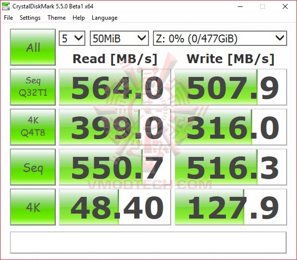 ด้านผลการทดสอบโดย AS SSD นั้นก็มีผลงานที่อยู่ในคลาสเดียวกันคือคือเกิน 500 เมกกะไบท์ต่อวินาที