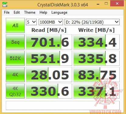AS SSD Benchmark ก็แรงดีเลยครับ เรียกได้ว่าการอ่านเขียนนั้นทำได้ดีครับแม้ว่าจะอัดข้อมูลลง 22เปอร์เซ็นของความจุก็ไม่ทำให้ความเร็วนั้นตกลงแต่อย่างใดครับ เรียกได้ว่าลดลงบ้างหรือแทบไม่แตกต่างจากพื้นที่ว่างเลยครับ เยี่ยมจริงๆ