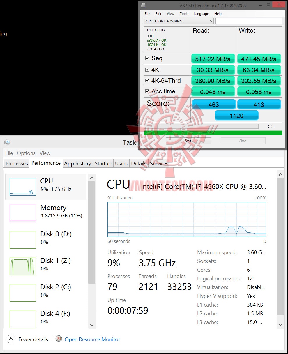 เมื่อเปิดใช้งาน PlexTurbo ความเร็วในการเข้าถึงข้อมูลกระฉูดมาก อ่านเขียนได้เร็วเหลือเฟือเลยครับ โดยในขณะที่ทำการทดสอบช่วงนี้นั้นผมได้ทำการตรวจสอบการเรียกใช้ทรัพยากรระบบของเจ้า PLEXTOR SSD M6Pro ไปด้วย ไม่รู้สึกว่ามีการดึงทรัพยากรส่วนใดเป็นพิเศษเลยนะครับ เจ๋งมาก