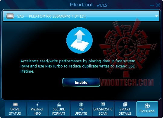 ตรงแถบเมนูด้านล่างครับ นอกจากจะมีการแสดงรายละเอียดของตัว SSD ที่ติดตั้งแล้ว มันยังสามารถทำ Secure Format หรือที่เราๆเรียกว่า Secure Erase ทำการอัพเดทเฟิร์มแวร์ และที่น่าสนใจที่สุดก็คือ PlexTurbo ซึ่งจะอยู่บริเวณขวาล่างของกรอบครับ