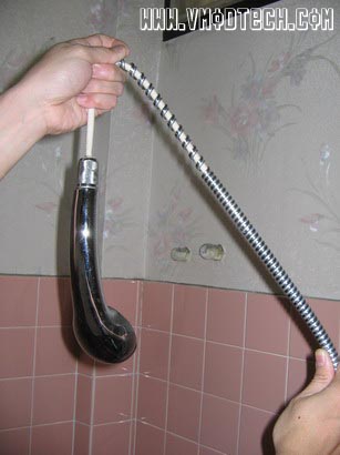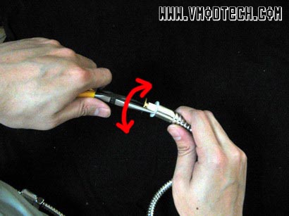หมุนตามเกลียวดึงหัวแสตนเลสที่ปิดทั้ง2ข้างของสายฝักบัวออก แต่ถ้ายังหมุนไม่ออกให้ใช้คิมปากยาวช่วยหมุนกลับไป-กลับมาจนออก แล้วใช้กรรไกรตัดสายอ่อนด้านในออกตามภาพครับ