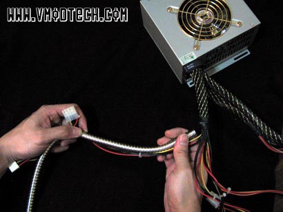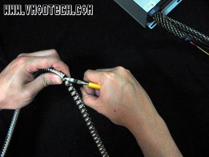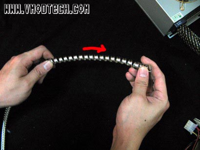 เสร็จแล้วเราก็ใช้คีมตัด ตัดแล้วบิดไปบิดมาจนกว่าแสตนเลสจะขาด(เหนียวนิดนึงนะครับ) แค่นี้ก็จะได้ท่อที่เตรียมไปหุ้มสายPower Supplyแล้วครับ