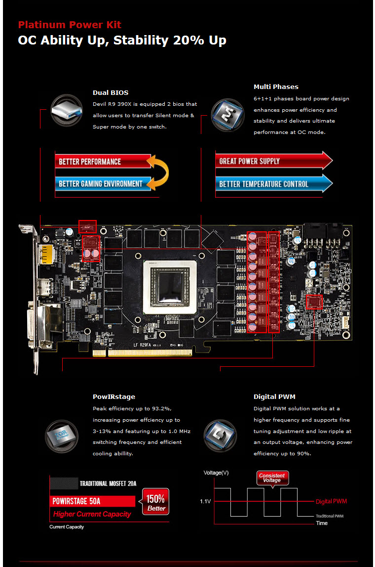 ภาคจ่ายไฟของ PowerColor Radeon R9 390X DEVILนั้นจัดมาให้รองรับการทำงานและรองรับการโอเวอร์คล๊อกมาอย่างเหลือเฟือเลยครับทั้งเฟสไฟและ digital PWM ที่จะช่วยจ่ายไฟในสถานะโอเวอร์คล๊อกได้ดีและได้ไฟที่ราบเรียบมากๆ ซึ่งตรงนี้จะช่วยเพิ่มเสถียรภาพเมื่อมีโหลดได้ดีมากครับ