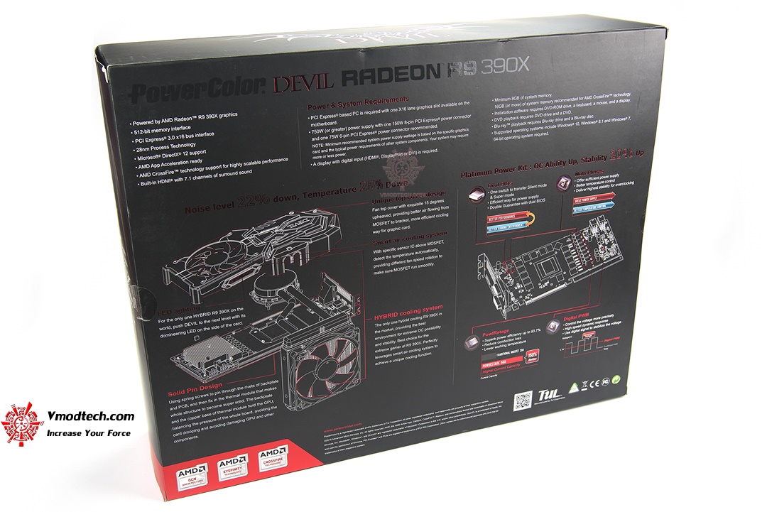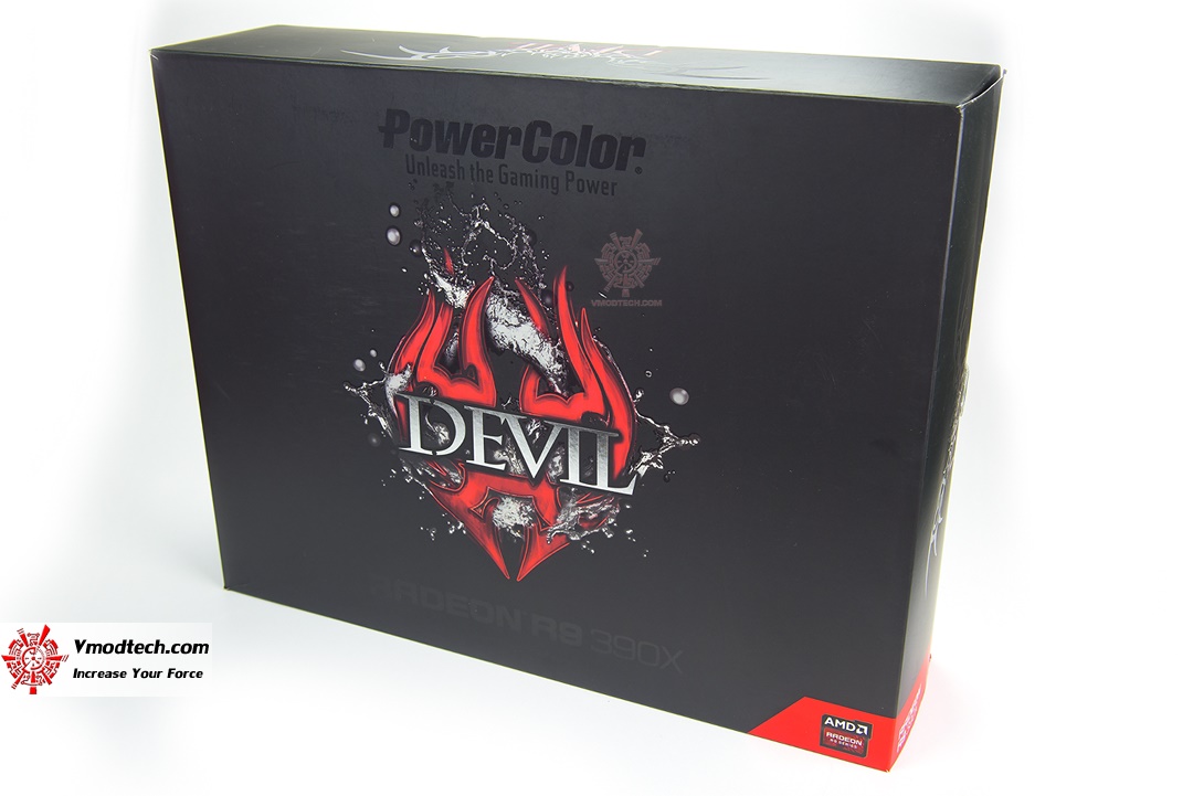 กล่องของ PowerColor Radeon R9 390X DEVIL นั้นได้ถูกออกแบบมาให้สะดุดตามากครับบ่งบอกถึงความเป็นปีศาจร้ายในคราบกราฟฟิกการ์ดได้เป็นอย่างดี ด้านหลังกล่องนั้นจะมีบรรยายสรรพคุณของตัว GPU และชุดระบายความร้อนรุ่นใหม่ล่าสุดเอาไว้
