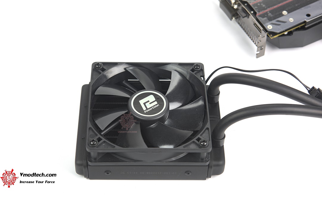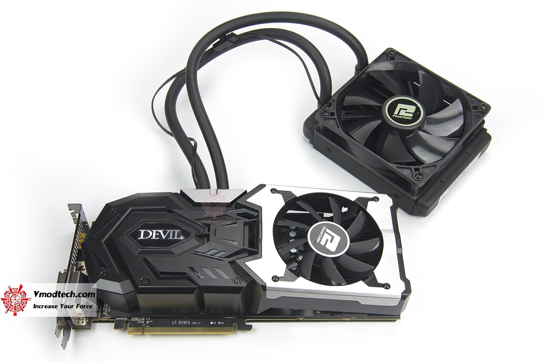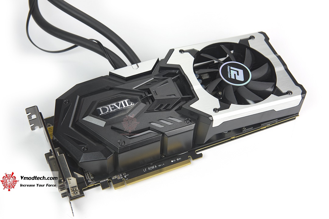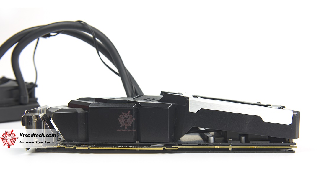 ความหนาสามสล๊อดแน่นๆ สังเกตุบริเวณท้ายการ์ดที่ติดตั้งพัดลมนะครับ PowerColor Radeon R9 390X DEVIL ได้ทำองศาเอียงเอาไว้ประมาณสามสิบองศาเพื่อให้พัดระบายความร้อนบริเวณซิ้งค์ภาคจ่ายไฟและพัดผ่านไปยังจุดที่ติดตั้ง GPU Block ด้วย เย็นทั้งระบบเลยครับแบบนี้