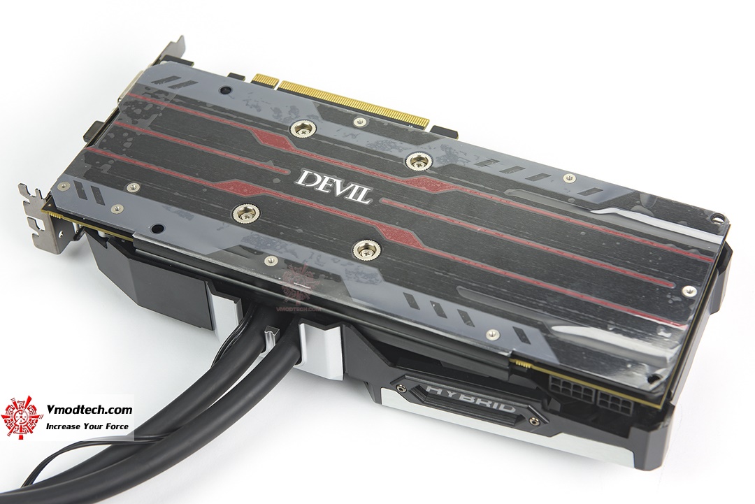 ตัวการ์ดนั้นต้องการไฟจาก PSU ด้วยหัวแบบ PCIe แบบแปดพินและหกพินอย่างละหัวครับ แบคเพลทสวยงามดุดัน ไฟ HYBRID นั้นจะติดเป็นสีขาวเมื่อเสียบใช้งาน