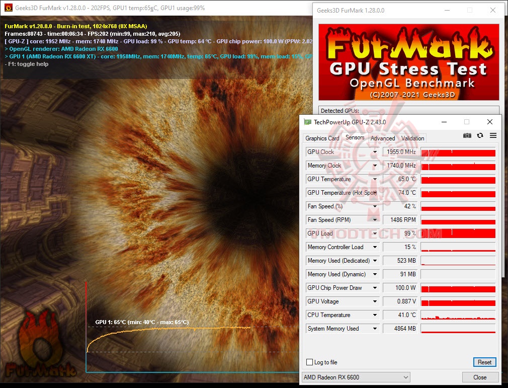 ความร้อนนั้นสูงสุดอยู่ที่ไม่เกิน 65 องศาเซลเซียสนอกเคสโดยที่รอบพัดลมทำงานตามโพรไฟล์ของการ์ดที่ประมาณ 42% แทบไม่ได้ยินเสียงรบกวน