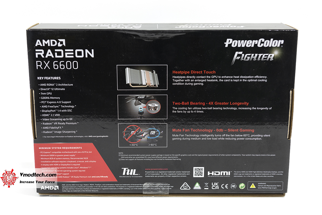 กล่องบรรจุของตัวการ์ด PowerColor Radeon RX 6600 Fighter มีขนาดกลางๆครับ มีรายละเอียดด้านเทคโนโลยีของชุดระบายความร้อนอยู่ที่ด้านหลัง