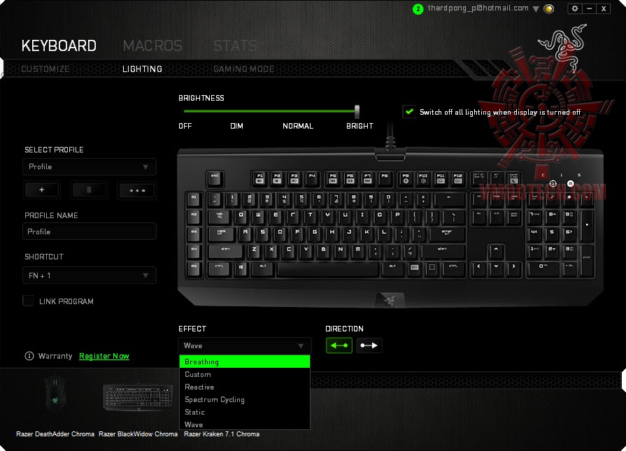 - Spectrum cycling : แสงไฟจะปรับไล่โทนสีอัตโนมัติทั้งคีย์บอร์ด