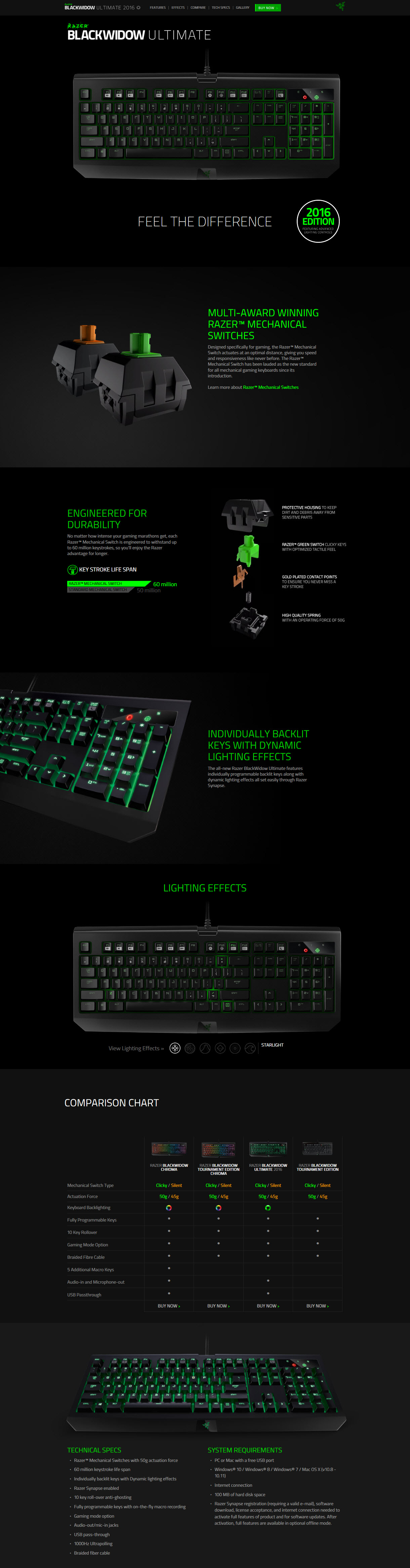 สำหรับ RAZER Blackwidow Ultimate 2016 นั้นเป็น Mechanical Keyboard ที่ใช้สวิทซ์ที่ออกแบบโดยเรเซอร์เอง แต่เพิ่มเติมขึ้นมานั้นก็คือความสามารถในการปรับแต่งแสงสีรวมถึงแรงกดที่ต้องใช้ประมาณ 50 กรัมและความทนทานที่มากกว่าแมคคานิคอลสวิทซ์ทั่วๆไปด้วย