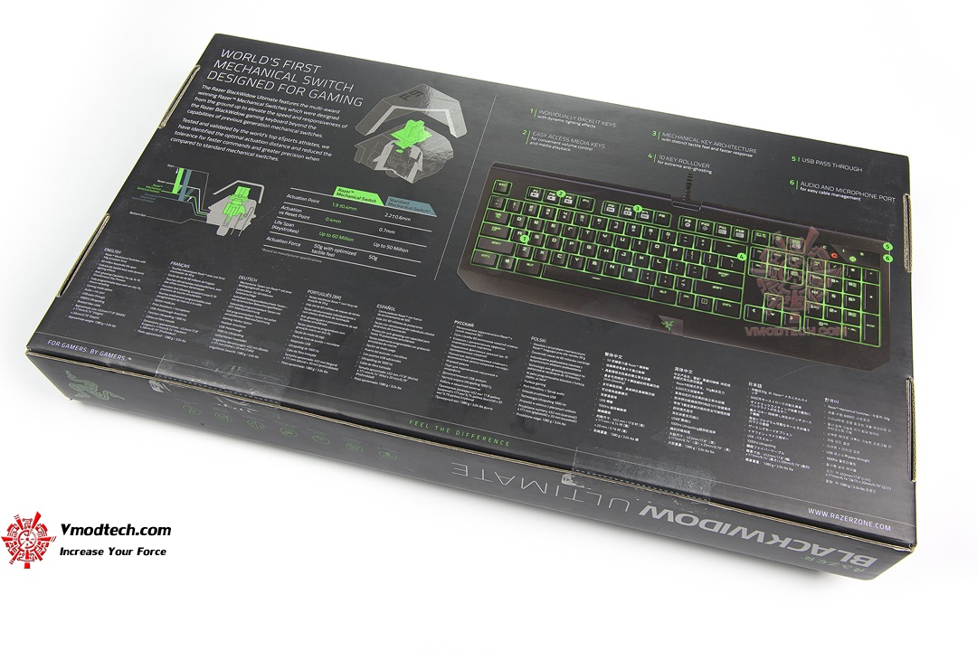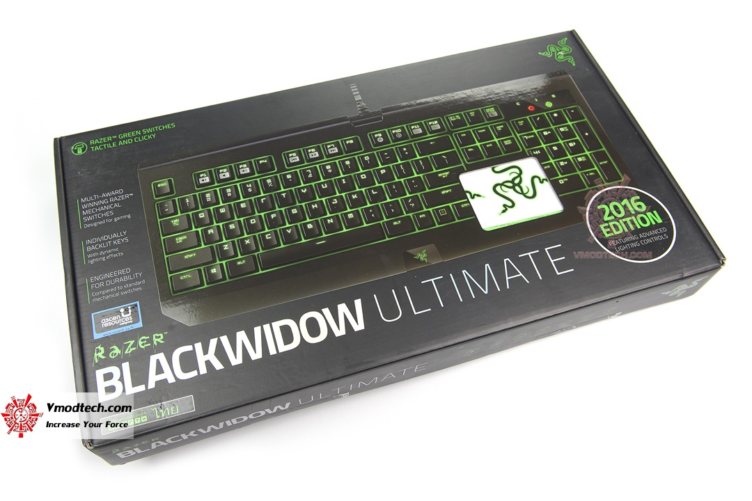 กล่องบรรจุตัวคีย์บอร์ดก็มาในสไตล์เรียบหรูดูดีแบบเรเซอร์ ด้านหลังโชว์คุณสมบัติของสวิทซ์สีเขียวของเรเซอร์ที่ต้องใช้แรงกด 50 กรัม ซึ่งแน่นๆกว่า Stealth นิดหน่อยพอรู้สึกได้เลย