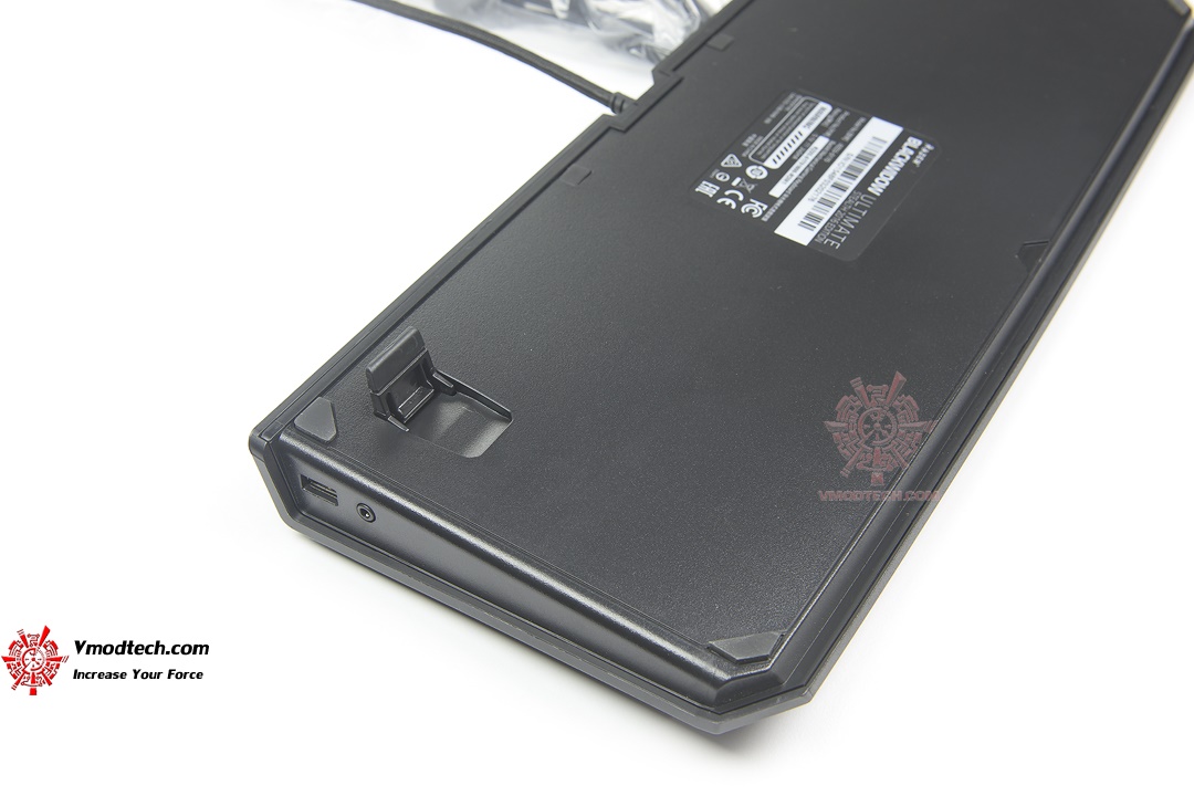 ด้านล่างของคีย์บอร์ดนั้นสามารถปรับความสูงได้เช่นเคย และที่บริเวณด้านขวามือนั้นจะมีช่องเสียบ USB และหูฟังอย่างละหนึ่งช่องครับ ซึ่งก่อนใช้งานเราต้องเสียบสายไปที่หลังเมนบอร์ดให้ครบก่อนนะ
