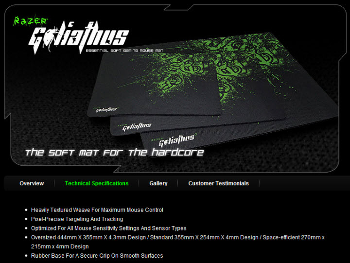 แผ่นรองเมาส์เองนั้นก็มีทำออกมาในหลายรูปแบบ ไม่ว่าจะเป็นแบบอ่อน แบบแข็ง แบบลื่น แบบฝืด ก็ว่ากันไปตามกำลังทรัพย์และความเชื่อครับ สำหรับวันนี้หยิบเอา RAZER Goliathus ซึ่งวางขายกันอยู่ในตลาดขณะนี้มาแนะนำครับ เดี๋ยวเราไปชมรายละเอียดบางส่วนจากหน้าเว็บของ Razer กันก่อนครับ