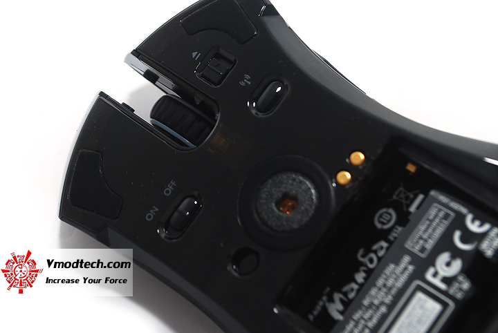 ด้านใต้ของ MAMBA ครับ บริเวณซ้ายจะเป็นสวิทซ์ เปิด/ปิด ส่วนด้านขวาจะเป็นปุ่มล๊อคสาย USB กรณีใช้สายกับ Mouse ครับ