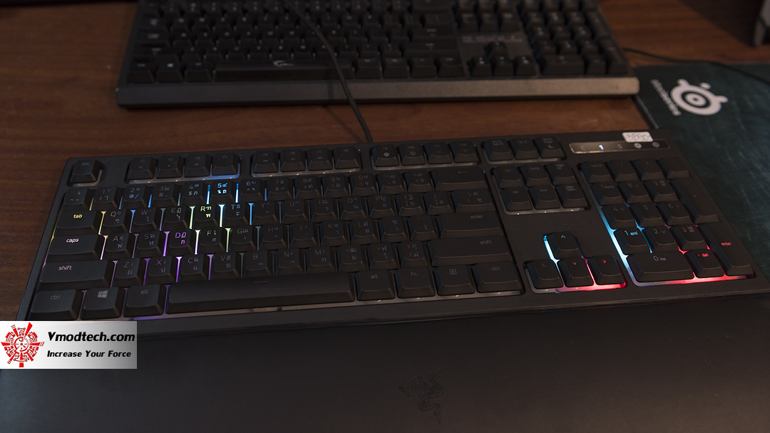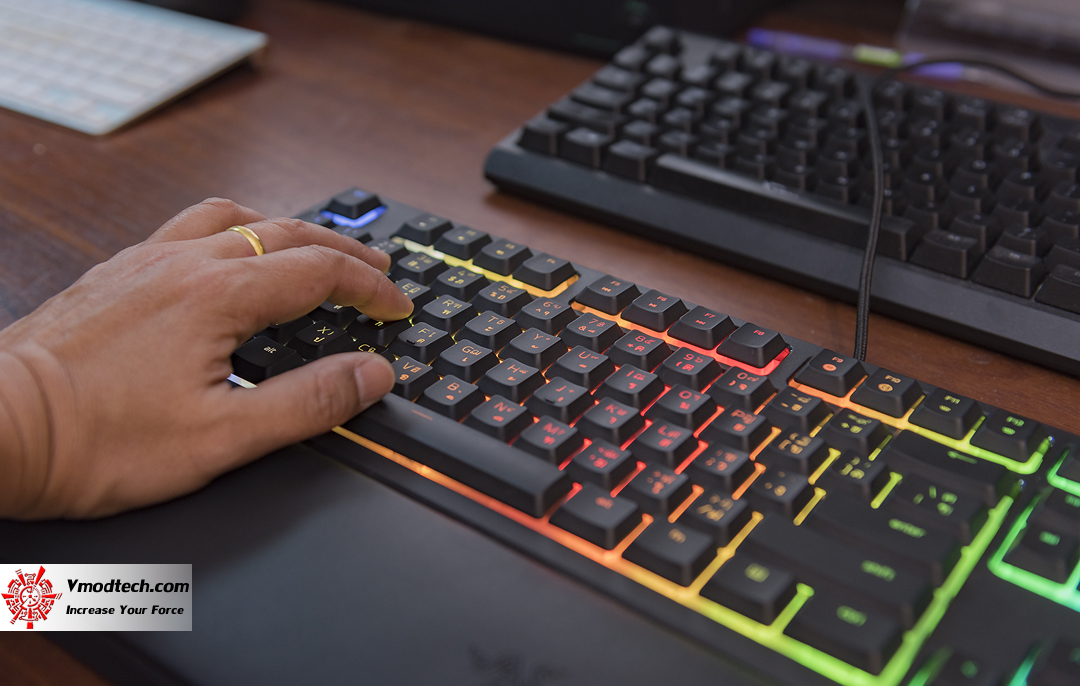 หลังจากที่ได้ทดลอง RAZER ORNATA CHROMA นั้น ผมรู้สึกถึงความแตกต่างระหว่างคีย์บอร์ดตัวนี้กับคีย์บอร์ดแบบ Mechanical Switch พอสมควรครับ อย่างแรกคือฟีลลิ่งของระยะคลิ๊กที่สั้นกว่าประมาณ 1 ในสาม น้ำหนักที่ออกแรงกดนั้นอยู่ประมาณสวิทซ์ Blue ของ Cherry MX เสียงก็ประมาณ Blue เช่นกันครับ คือจะมีเสียงคลิ๊กแหลมๆเบาๆเมื่อกดลงไป สำหรับคนที่พิมพ์ได้ค่อนข้างเร็วนั้น ปุ่มแบบนี้ไม่เป็นอุปสรรรคกับการพิมพ์แน่นอนครับ