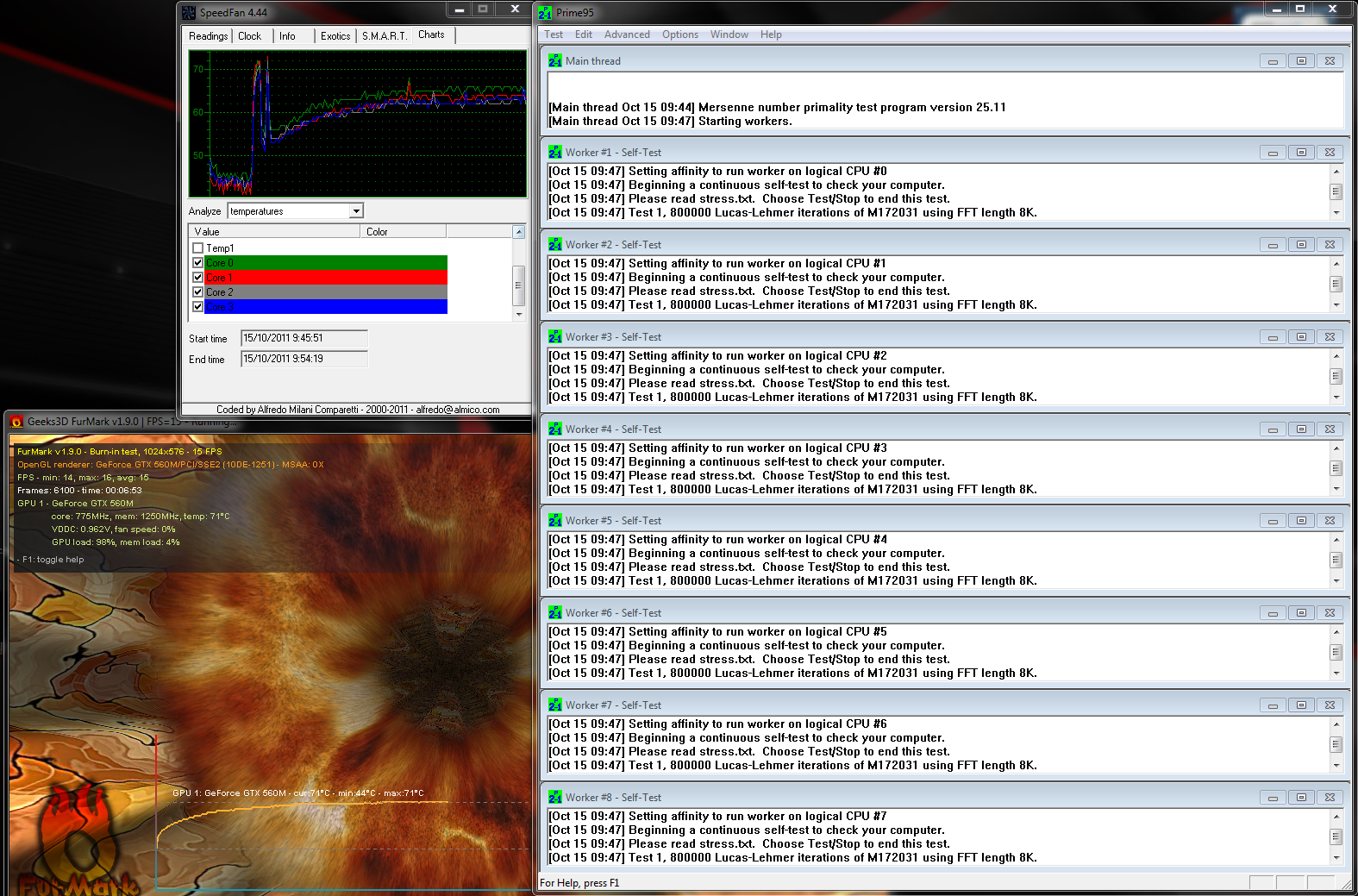 …ทดสอบด้วยการรัน prime95 แบบ small fft พร้อมกับเปิด Furmark โหมด XtremeBurnin เพื่อให้ได้อุณหภูมิของระบบสูงสุดทั้งซีพียูและกราฟฟิคชิป