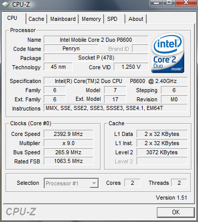 | Processor | Intel® Pentium Dual core P8600 “Penryn 3M” 2.4GHZ L2 3mb FSB1066mhz |