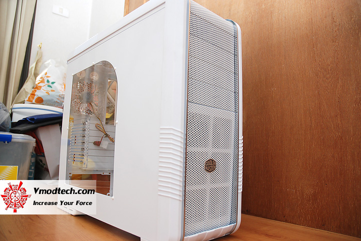 ด้านหลังก็มีการพ่นสีขาวมาให้ในทุกซอกทุกมุม จะเห็นได้ว่าช่องลมรังผึ้งขนาดใหญ่ติดตั้งพัดลม 120mm 1200 rpm เช่นเดียวกันด้านหน้าติดมาให้จากโรงงาน รวมไปถึงรูสำหรับลอดสายยางสำหรับคนที่ใช้ระบบระบายความร้อนด้วยน้ำ ติดมาให้ด้วยครับ