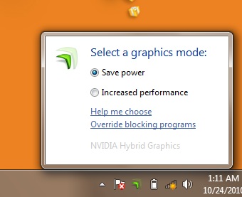 ใน Lenovo V460 นั้นจะมีกราฟฟิคชิปให้เลือกใช้ทั้งหมดสองตัวด้วยกัน คือ Intel GMA HD ที่ฝังอยู่ในซีพียู และ Nvidia Geforce G310 ที่เป็นชิปแยก โดยสามารถสับเปลี่ยนได้่จากไอคอนตรง System tray ดังภาพด้านบน โดย Save Power จะหมายถึงกราฟฟิคออนชิปของ Intel และ Increased Performance จะหมายถึงกราฟฟิคแยกของ Nvidia ครับ