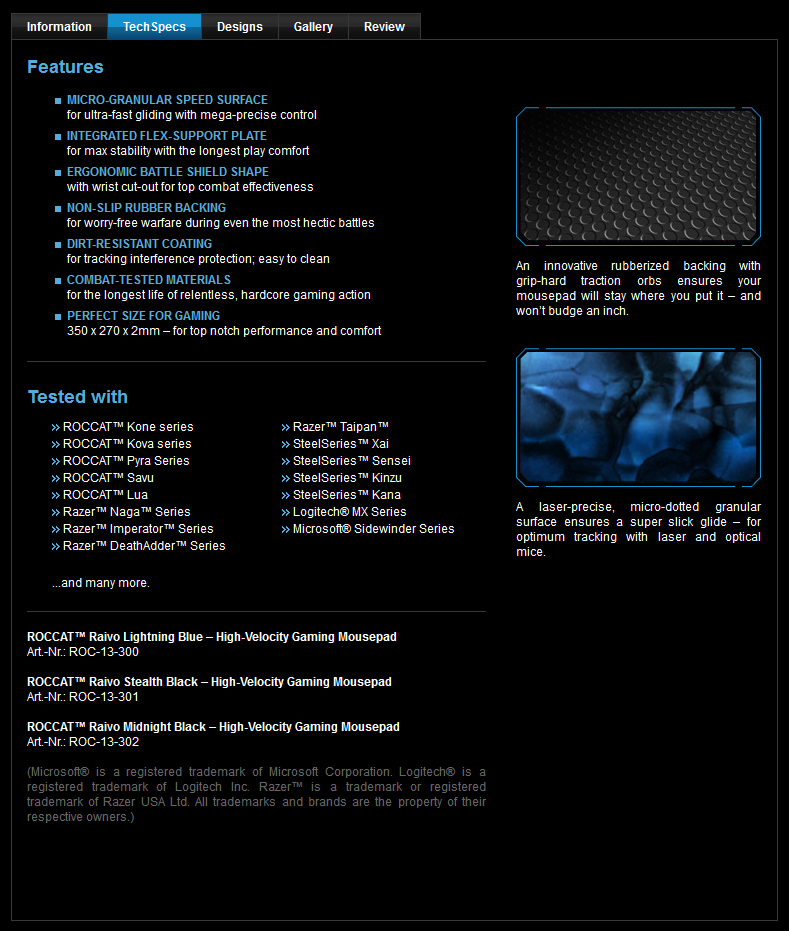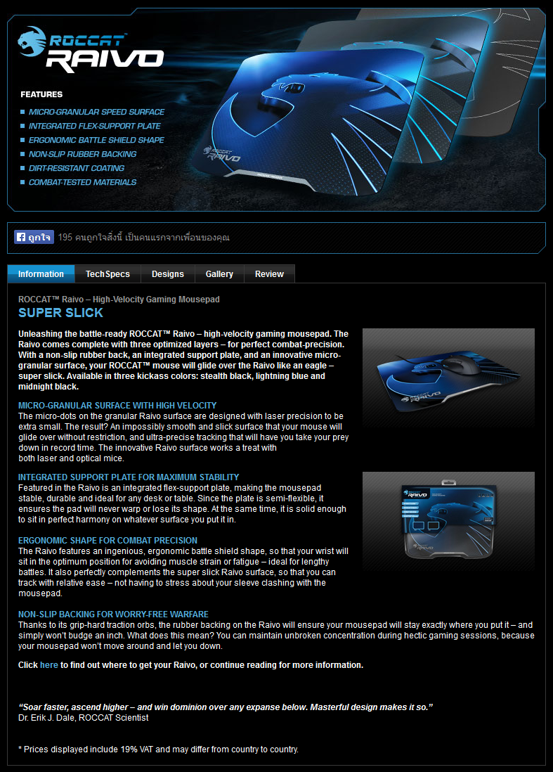 ……….สวัสดีครับ วันนี้ผมมพบ Gaming Mousepad สวยๆจาก ROCCAT กันครับ ในรุ่น ROCCAT™ Raivo Lightning Blue High-Velocity Gaming Mousepad ซึ่งเป็น Mousepad แบบแข็ง หนา 2mm. พับหรือม้วนไม่ได้นะครับ รายละเอียดจะเป็นอย่างไรเดี๋ยวไปชมพร้อมๆกันครับ ช่วงนี้ไปชมรายละเอียดจากผู้ผลิตก่อนครับ