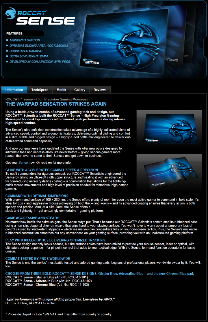 สวัสดีเช้าวันอาทิตย์ครับ เช้าวันนี้มีแผ่นรองเมาส์สวยๆจากค่าย ROCCAT มาให้ได้ชมกันโดยวันนี้จะมาแนะนำ Mousepad รุ่น SENSE Chrome Blue 2MM ขนาดความหนาสองมิลลิเมตรครับ สำหรับ ROCCAT นั้นก็เป็นผู้ผลิต Gaming Gear ที่มีชื่อเสียงระดับนึงในประเทศไทย โดยสายการผลิตนั้นก็จะครอบคลุมในทุกๆอุปกรณ์สำหรับคอเกมส์เลยทีเดียว จุดเด่นของ ROCCAT นั้นก็คือเอกลักษณ์ในการออกแบบอุปกรณ์ต่างๆไม่ว่าจะเป็นคีย์บอร์ด เมาส์ แผ่นรองเมาส์ หรือว่าที่ยกสายเมาส์ เป็นเอกลักษณ์เฉพาะมากๆครับ ซึ่งผมเองก็ได้รีวิวให้ได้ชมกันแล้วหลายๆชิ้น ล่าสุดก็จะเป็น ROCCAT SAVU ซึ่งสามารถกลับไปชมบทความได้ที่นี่ ROCCAT SAVU Mid-Size Hybrid Gaming Mouse Review มาติดตามรายละเอียดของ Mousepad รุ่น SENSE Chrome Blue กันได้เลย