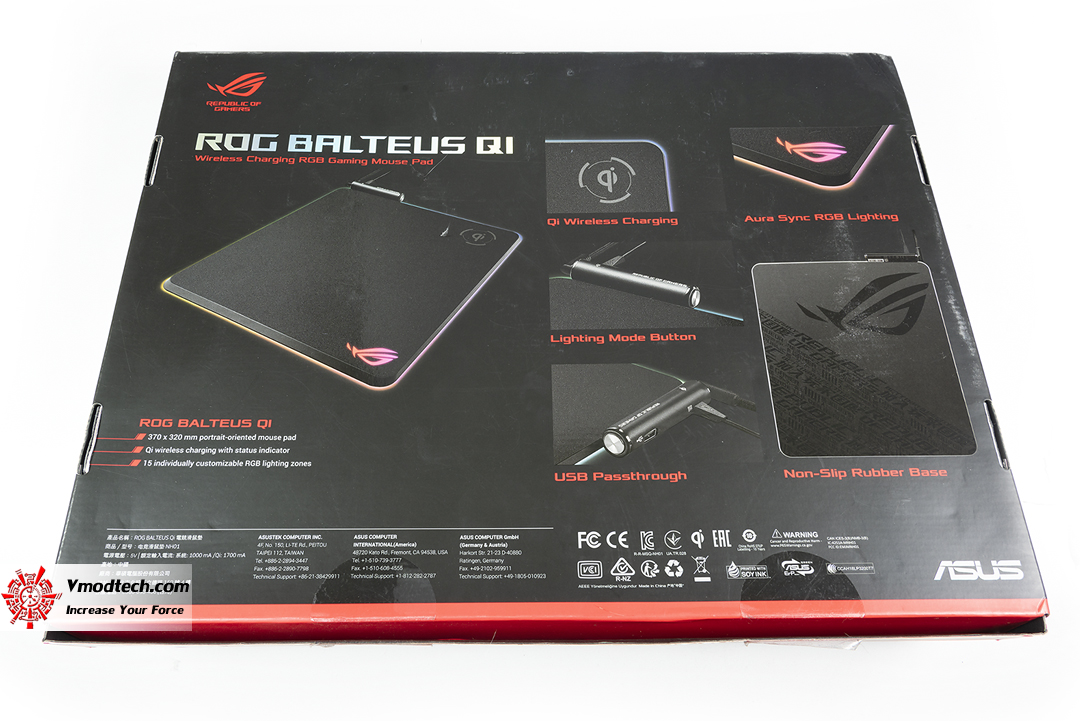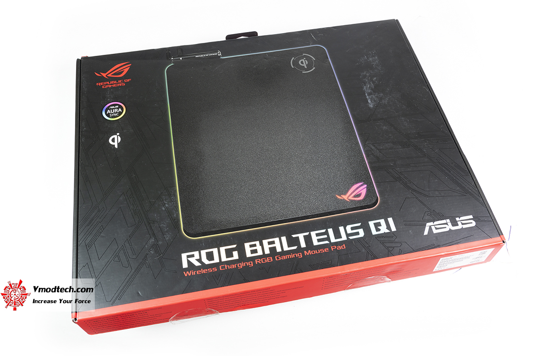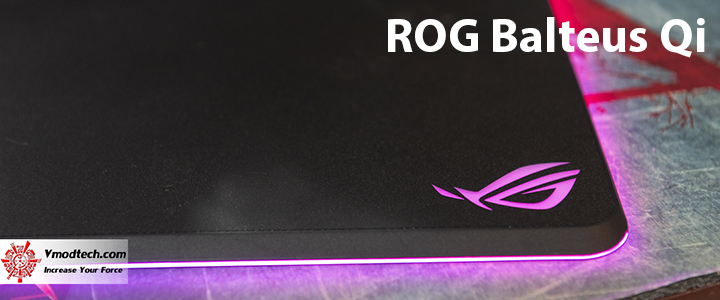 สวัสดีครับ เรายังอยู่กับอุปกรณ์ร่วมใช้งานในซีรีย์เกมส์มิ่งของ ASUS กันอีกครับ ASUS ROG Balteus Qi ซึ่งมันเป็นเมาส์แพดที่มีแสงไฟ RGB กระจายอยู่ 15 จุดจากด้านหลังของตัวเมาส์แพดที่สามารถรองรับ ASUS AURA SYNC และรองรับการชาร์จแบบไร้สายแบบ Qi Wireless Charging ครับ การวางเลย์เอาท์ของตัวเมาส์แพดที่ปกติจะเป็นแลนสเค๊ป แต่ ROG Balteus นั้นมาแบบพอทเทรทครับ คือแนวตั้งนั่นเอง ขนาดกว้างยาวนั้นอยู่ที่ 320 x 370 มิลลิเมตร และยังมีลวดลาย ROG Cybertext Graphics ที่ด้านหลังของตัวเมาส์แพดที่สวยงามมาก มาชมรายละเอียดกันเลยครับ
