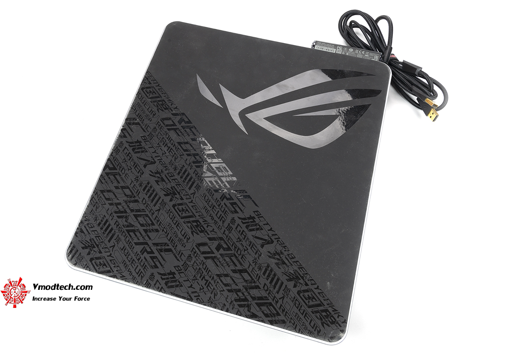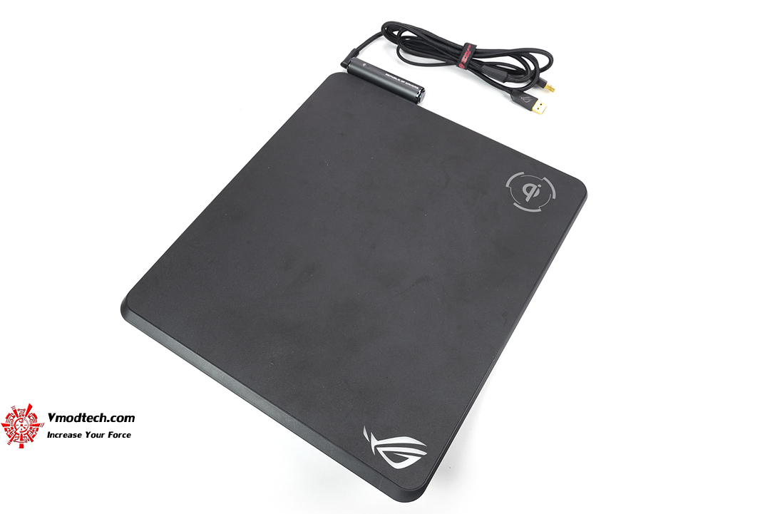 ลวดลายด้านหน้านั้นจะมีโลโก้ ROG ที่ด้านซ้ายล่างของตัวเมาส์ และที่ด้านบนขวาบนนั้นจะเป็นบริเวณที่ไว้สำหรับชาร์จโทรศัพท์มือถือที่รองรับการชาร์จแบบ Qi Wireless Charging
