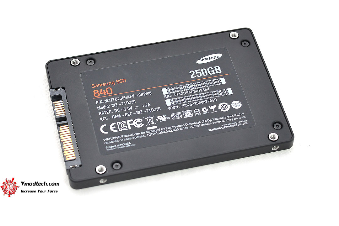 ตามสเป็กของ SAMSUNG 840 Series 250GB นั้น การเชื่อมต่อนั้นก็เป็น SATA 6Gb/s หรือ SATA-3 ครับและมีขนาด 2.5 นิ้วแบบทั่วๆไป Flash Memory แบบ TLC NAND 21 nm ของ Samsung และ Controller ก็เป็นของ Samsung เองด้วย