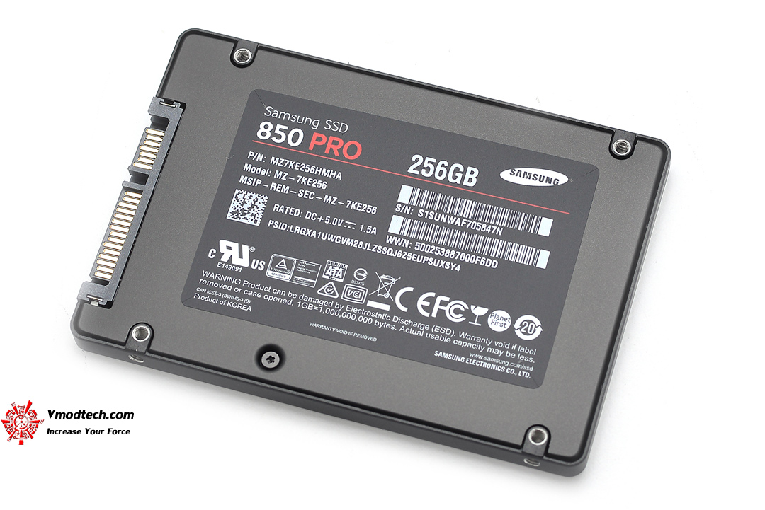 กล่องของ SAMSUNG SSD 850 PRO 256GB นั้นสีสรรสวยงามด้วยโทนดำตัดกับคำว่า PRO สีแดง ตัว SSD นั้นมีการเชื่อมต่อแบบ SATA 6Gb/s หรือ SATA-3 ครับและมีขนาด 2.5 นิ้ว หนาด 6.8 มิลลิเมตร